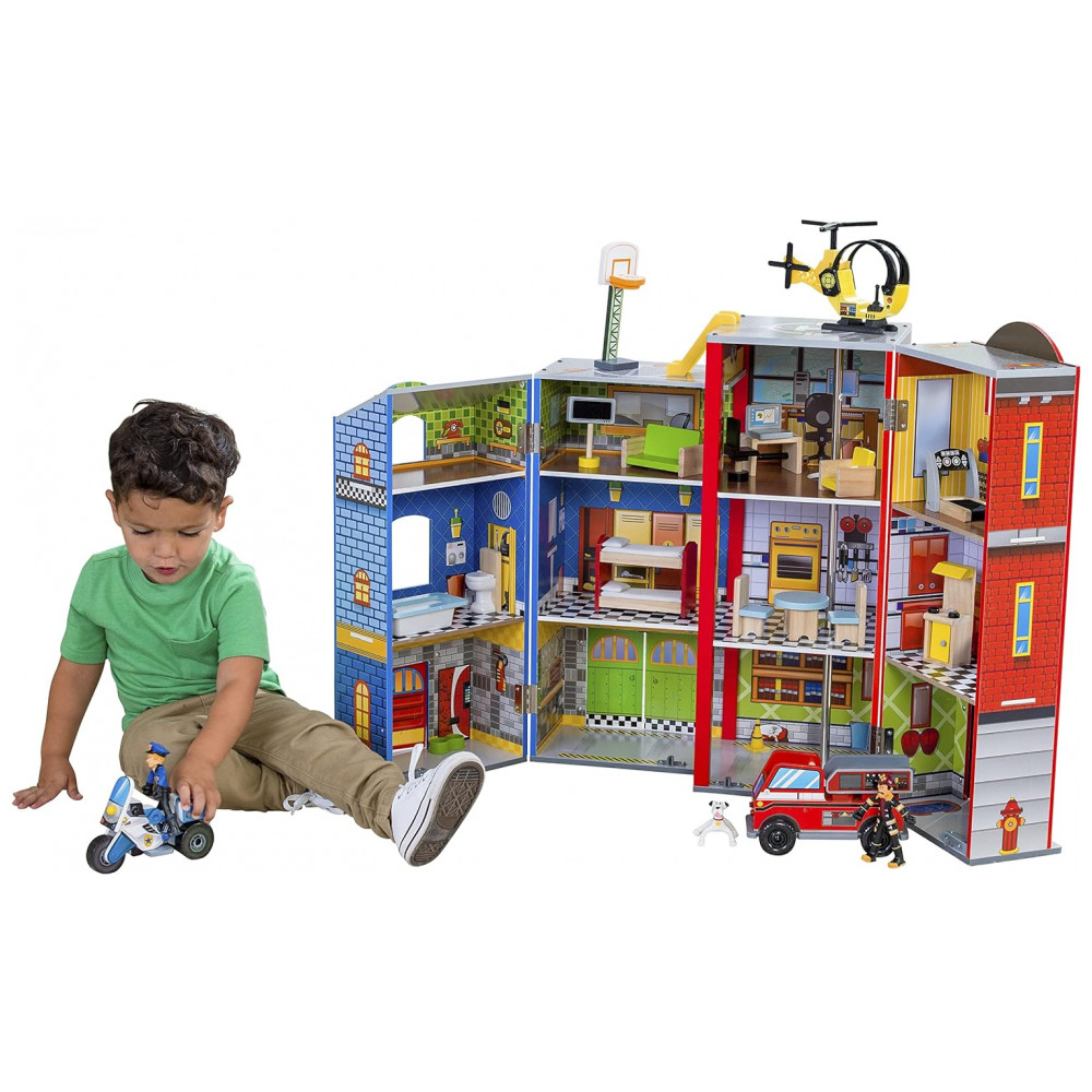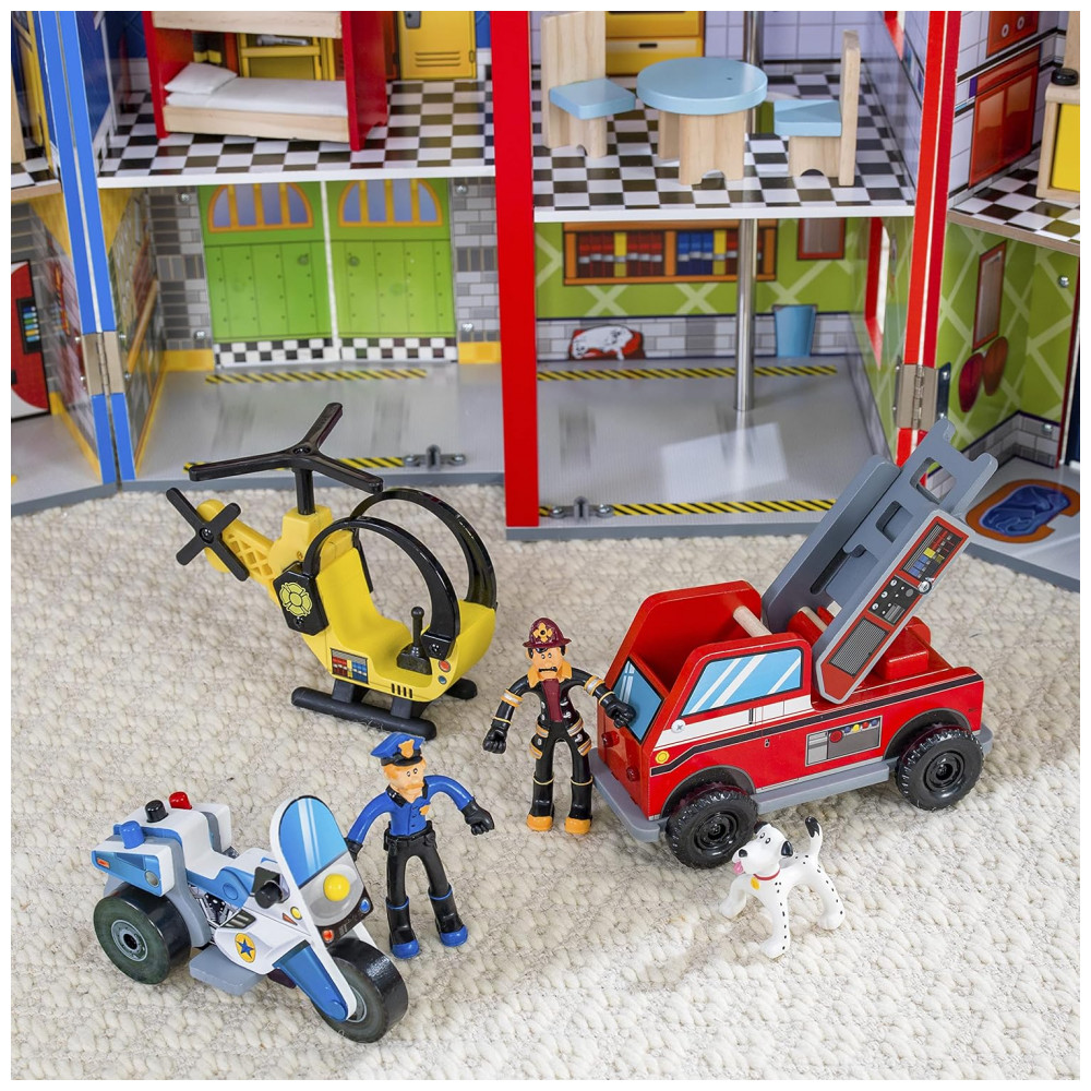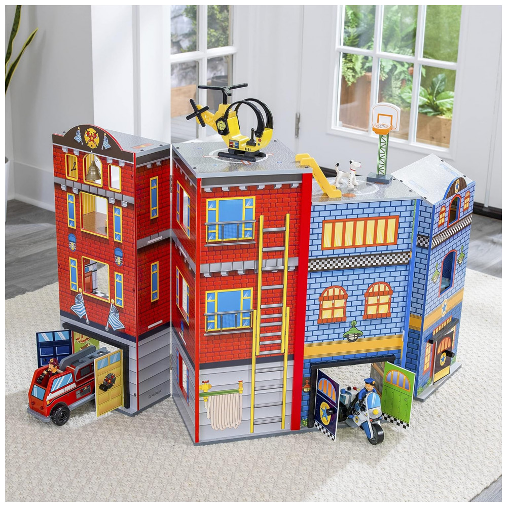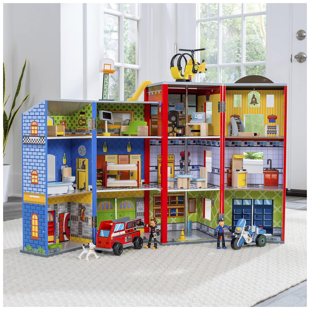 Posto de Bombeiros de Madeira Dobrável com 3 Andares e 26 Acessórios KidKraft Azul