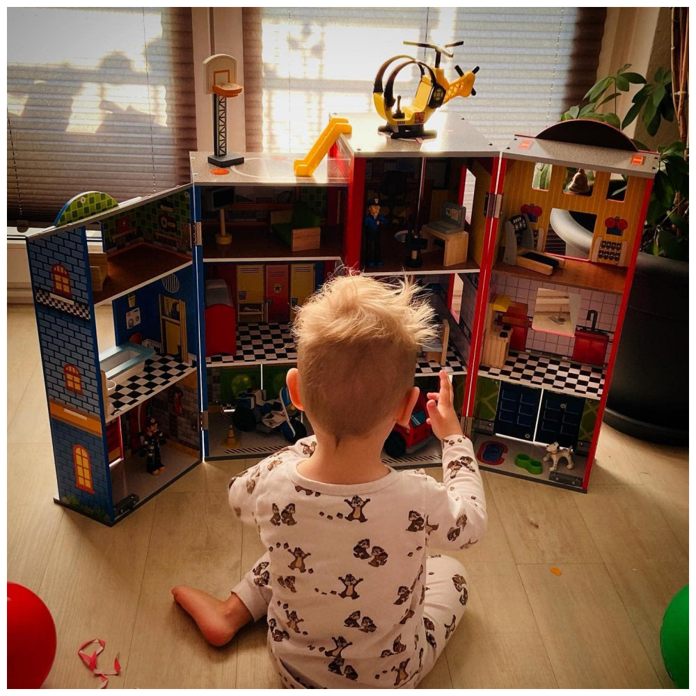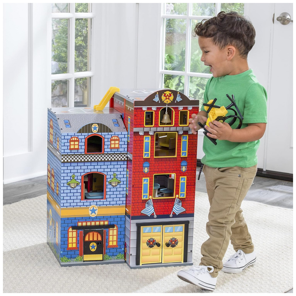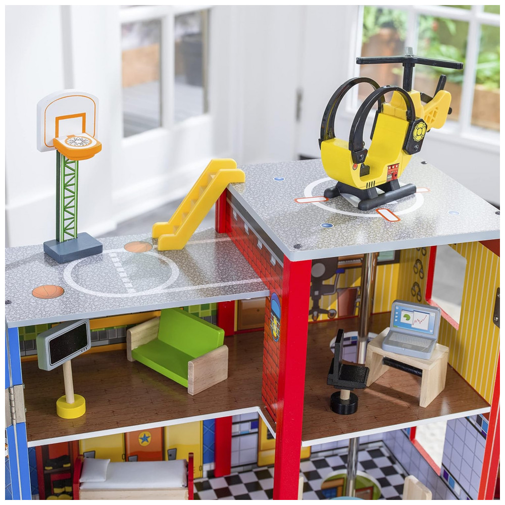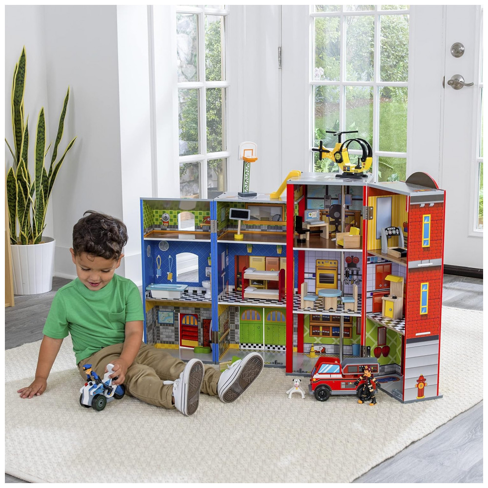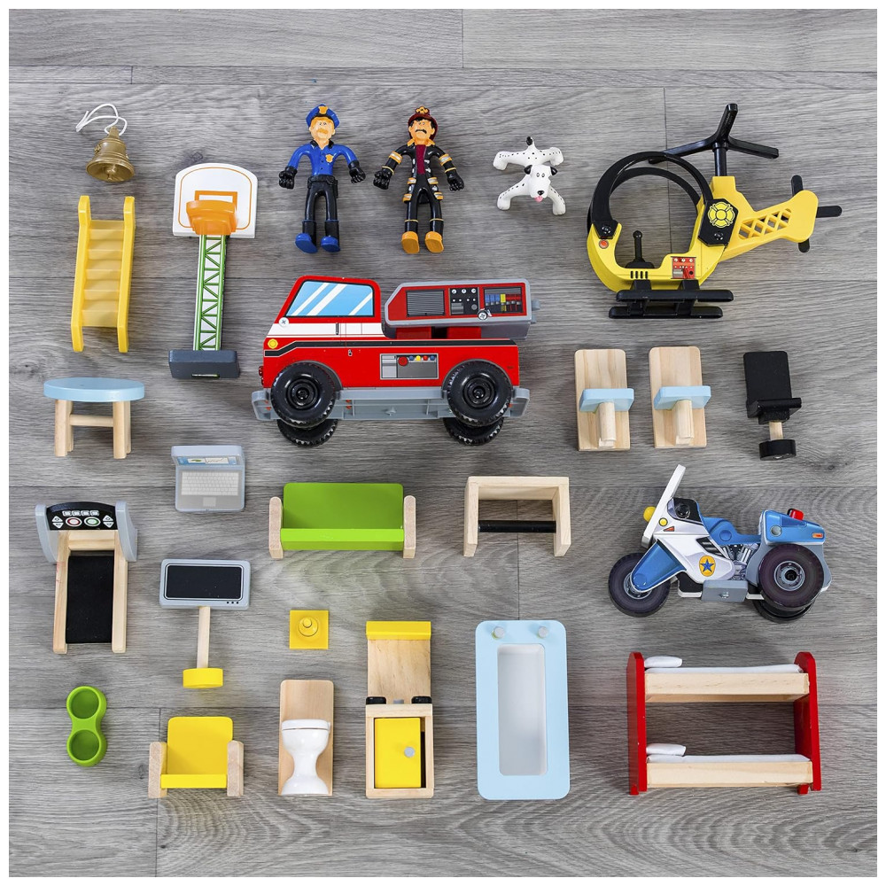 A ajuda está a caminho com o Playset de madeira KidKraft Everyday Heroes. As crianças vão se divertir com cinco alarmes com esta casa de incêndio de madeira de três níveis que se abre para brincadeiras expandidas. Um total de 12 quartos temáticos e um poste de incêndio do chão ao chão garantem a imaginação das crianças enquanto exploram o que significa ser um herói da vida real. O kit de acessórios de 26 peças incluído apresenta uma motocicleta da polícia, caminhão de bombeiros, cão de bombeiros e muito mais. Pouse o helicóptero no heliporto no telhado. Um bombeiro e um policial têm braços e pernas dobráveis, para que caibam mais facilmente nos veículos e adicionem ação à brincadeira. Quando a brincadeira termina, o conjunto se fecha em dobradiças resistentes para facilitar a limpeza.