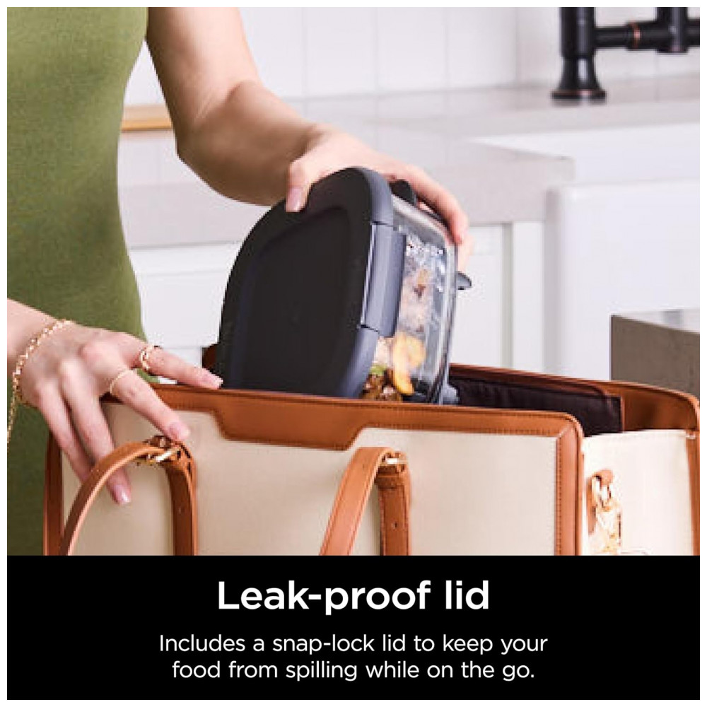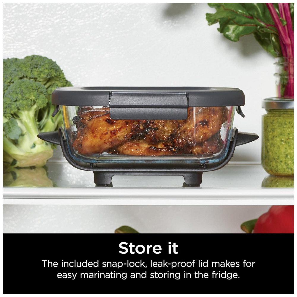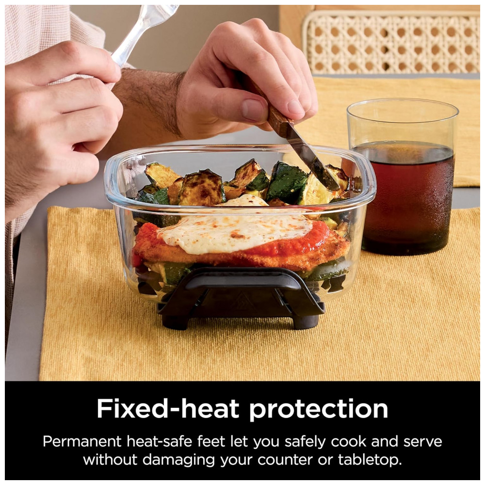 O formato retangular facilita o aproveitamento de espaço em refrigeradores, freezers e no interior do sistema Ninja Crispi, além de favorecer empilhamento com outros recipientes compatíveis. As alças de pega integradas nas laterais do vidro contribuem para o manuseio seguro ao transferir o recipiente entre bancada, forno, micro-ondas e mesa.