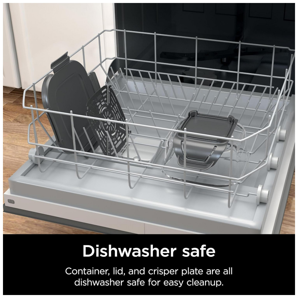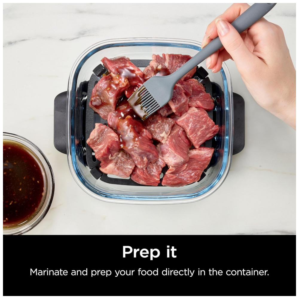 O vidro é compatível com o sistema Ninja Crispi PowerPod, suportando temperaturas de cocção de até 232 °C, o que possibilita o uso direto em equipamentos de cocção compatíveis e no forno, além de uso em micro-ondas sem a tampa. A superfície interna em vidro é livre de PFAS e PTFE, favorecendo uma área de contato lisa para cocção e facilitando a limpeza após o uso.