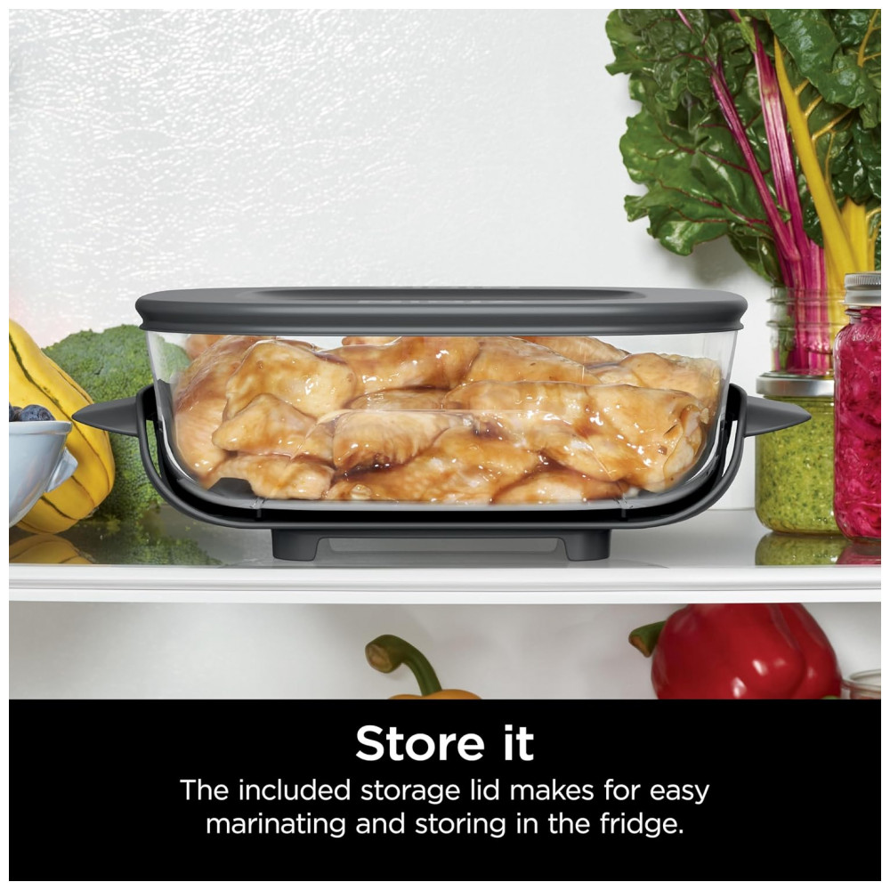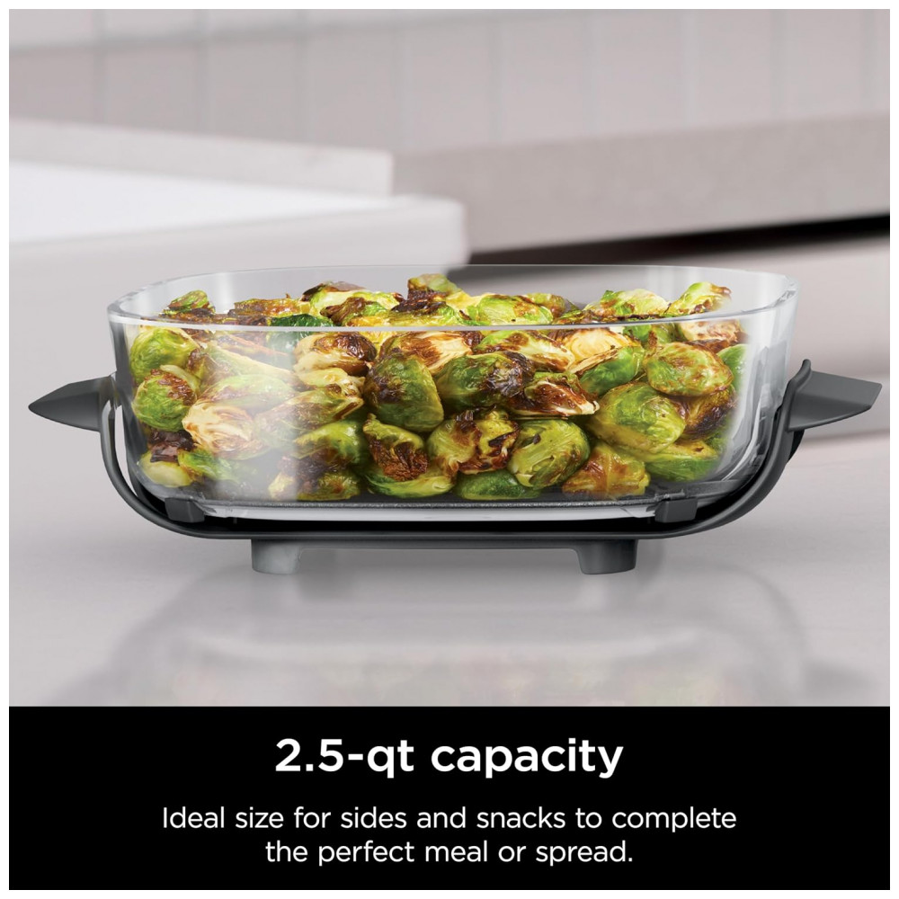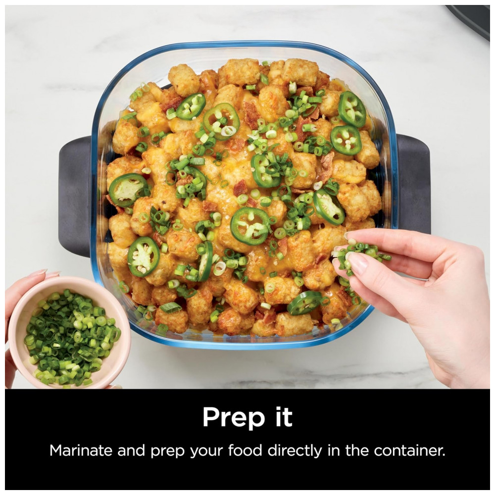 O pote de vidro Ninja CleanCrisp 2,4 L foi desenvolvido para preparo e armazenamento de alimentos em porções médias, com recipiente retangular em vidro resistente ao calor e tampa de armazenamento com vedação contra vazamentos. A capacidade de 2,4 litros é adequada para acompanhamentos, porções de batatas fritas, asas de frango, legumes e refeições para até 4 pessoas.