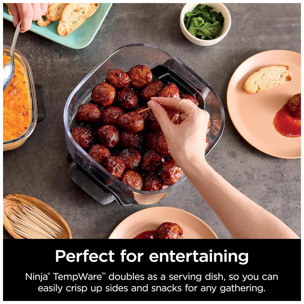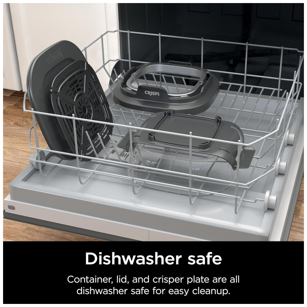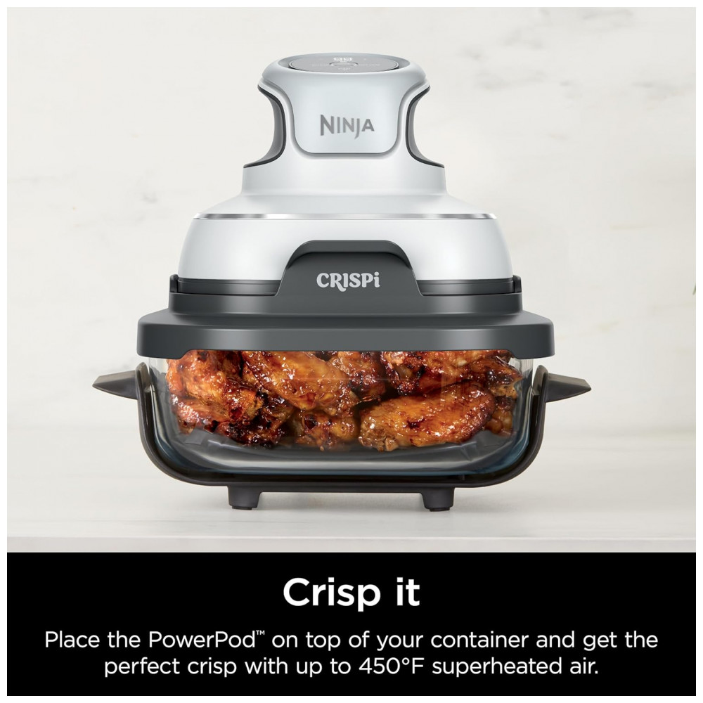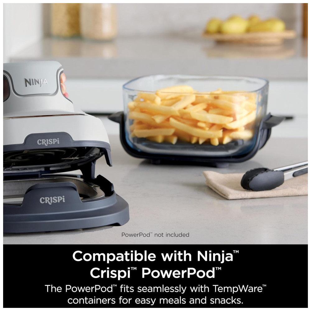 O vidro é compatível com o sistema Ninja Crispi PowerPod, suportando temperaturas de cocção de até 232 °C, permitindo o uso direto em equipamentos de cocção compatíveis, no forno e em micro-ondas sem a tampa. A superfície interna em vidro é livre de PFAS e PTFE, favorecendo cocção em superfície lisa e facilitando a limpeza após o uso.