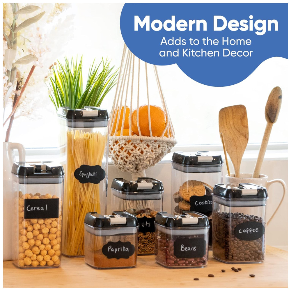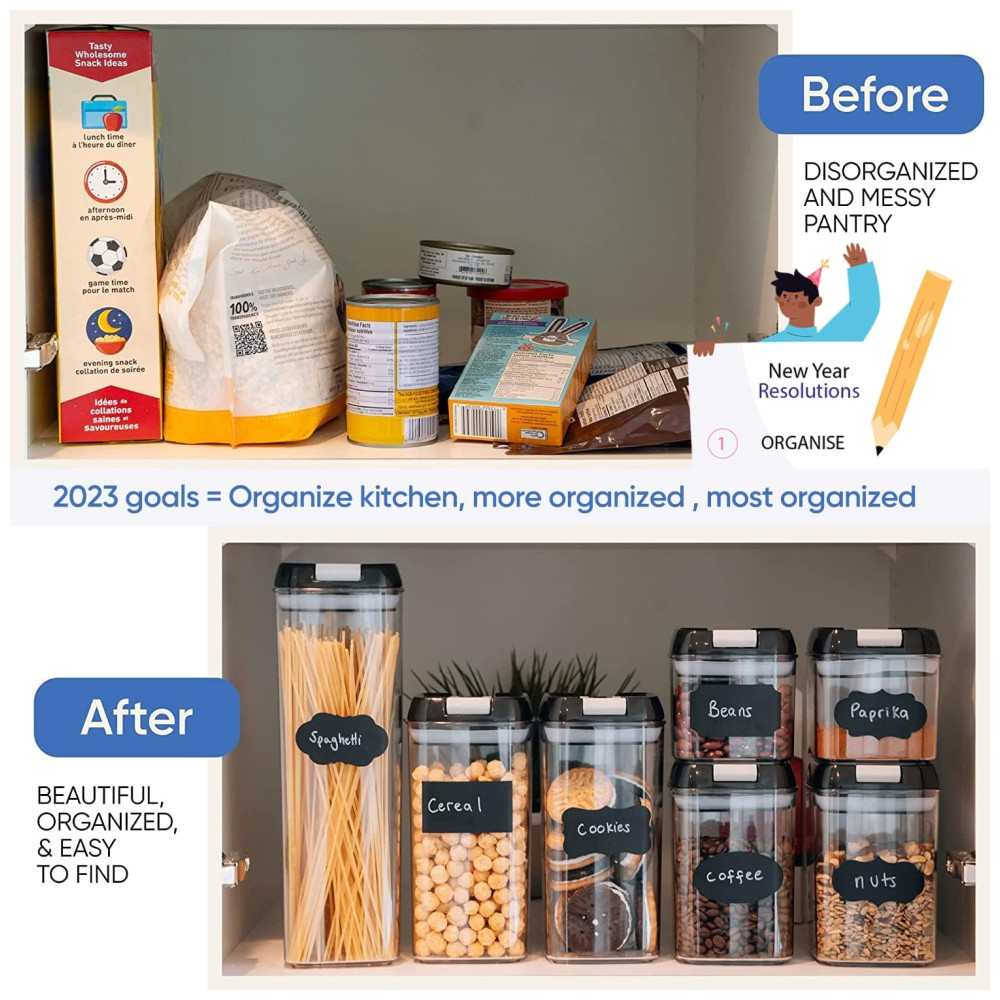 PACOTE SUPERIOR Seu pacote completo vem com 7 recipientes de zenamento de alimentos Premium SEM BPA, etiquetas de quadro negro reutilizáveis, permitindo que você organize sua despensa como nunca antes. Este conjunto vem em uma linda caixa que o torna um PRESENTE IDEAL para qualquer família. Ninguém mais no oferece mais valor para você do que nós