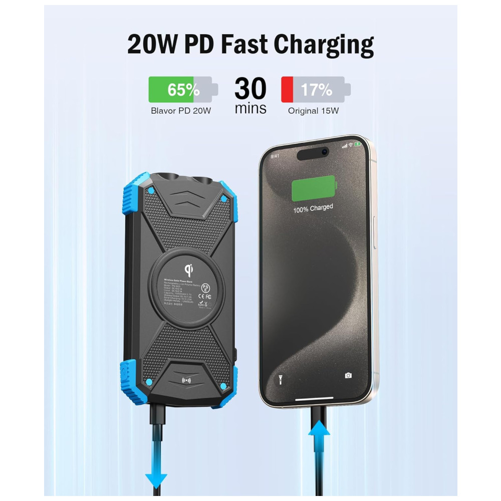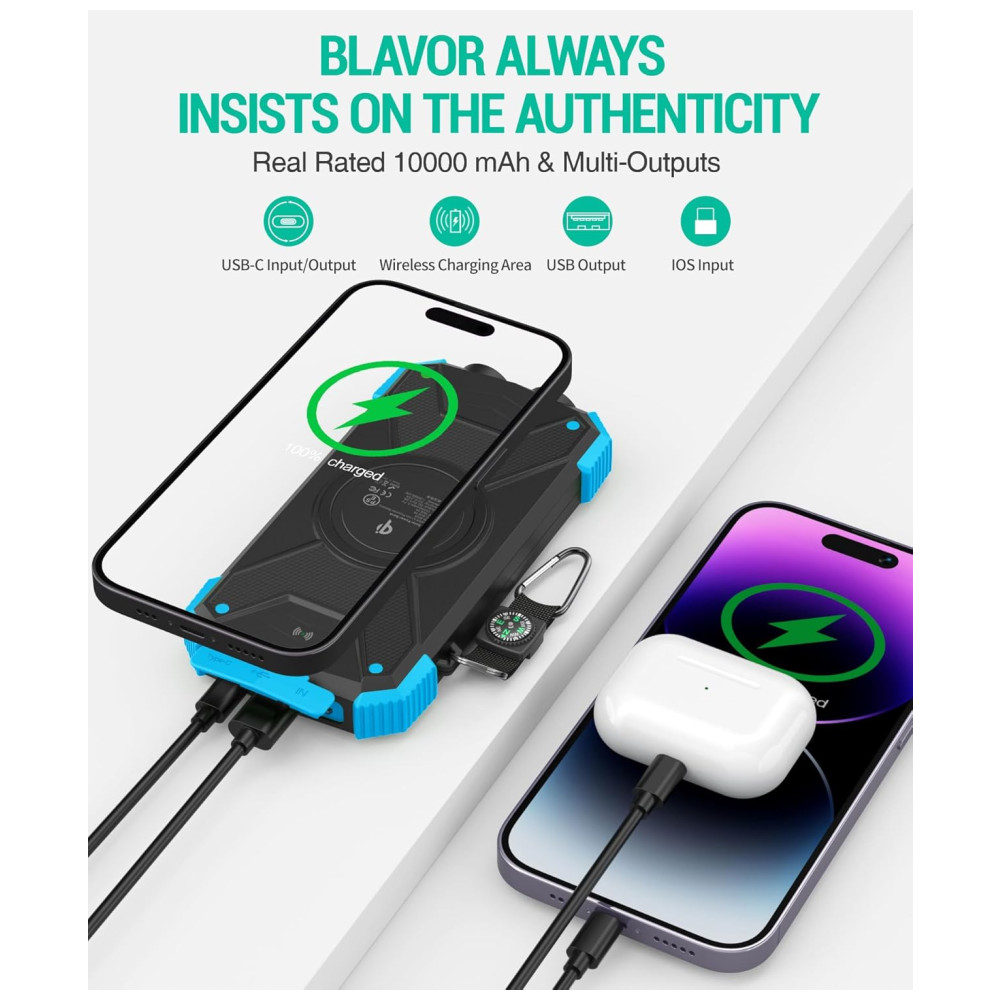 Carrtegador Solar Sem Fio O banco de potência mais recente em 10.000 mAh. Não apenas o banco de alimentação sem fio, mas também o carregador sem fio compatível com o iPhone XR , XR MAX , XS , X , 8 , 8plus, o Samsung Galaxy S9 , S9plus S8 , S8plus e todos os dispositivos habilitados para qi. Verdadeiramente sem cabos e sem emaranhados. REM LEMBRETES AMIGÁVEIS SOBRE SOLAR Por favor, saibam que o carregamento solar é uma característica adicional, o resultado real pode não ser tão positivo quanto o esperado para o tamanho pequeno do painel, grande capacidade e intensidade incontrolável da luz solar. Obrigado pela sua compreensão EXTENSIVO TEMPO DE CARGA TESTADO. Os tempos de carregamento do banco de potência sem fio BLAVOR foram extensivamente testados. Itself pode ser totalmente recarregada em torno de 6horas com 5V , 2A adaptador, ele pode cobrar iphone7plus até 2.2vezes, iPhone X até 2.3vezes, iphone8 até 3.5vezes. Melhores recursos de energia de emergência. ROBUSTO DURÁVEL E COMPACTO TAMANHO. Banco de potência BLAVOR é feito de materiais ABS à prova de fogo premium e bateria de polímero de lítio premium, altamente resistente e durável. IPX4 prova de respingo, seu equipado com USB, tipo C, duas lanternas e um kit de bússola. Peso leve e tamanho compacto. NOTA O tipo C é uma porta de entrada e não uma saída