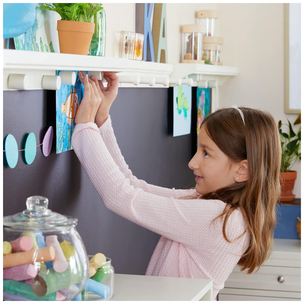 A prateleira expositora Martha Stewart Crafting Kids’ Art Display foi desenvolvida para pendurar e exibir desenhos, pinturas e projetos de arte infantil sem o uso de alfinetes ou tachinhas. O trilho magnético frontal utiliza ímãs fortes para segurar as folhas, permitindo substituir as produções com facilidade e mantendo o material preservado.