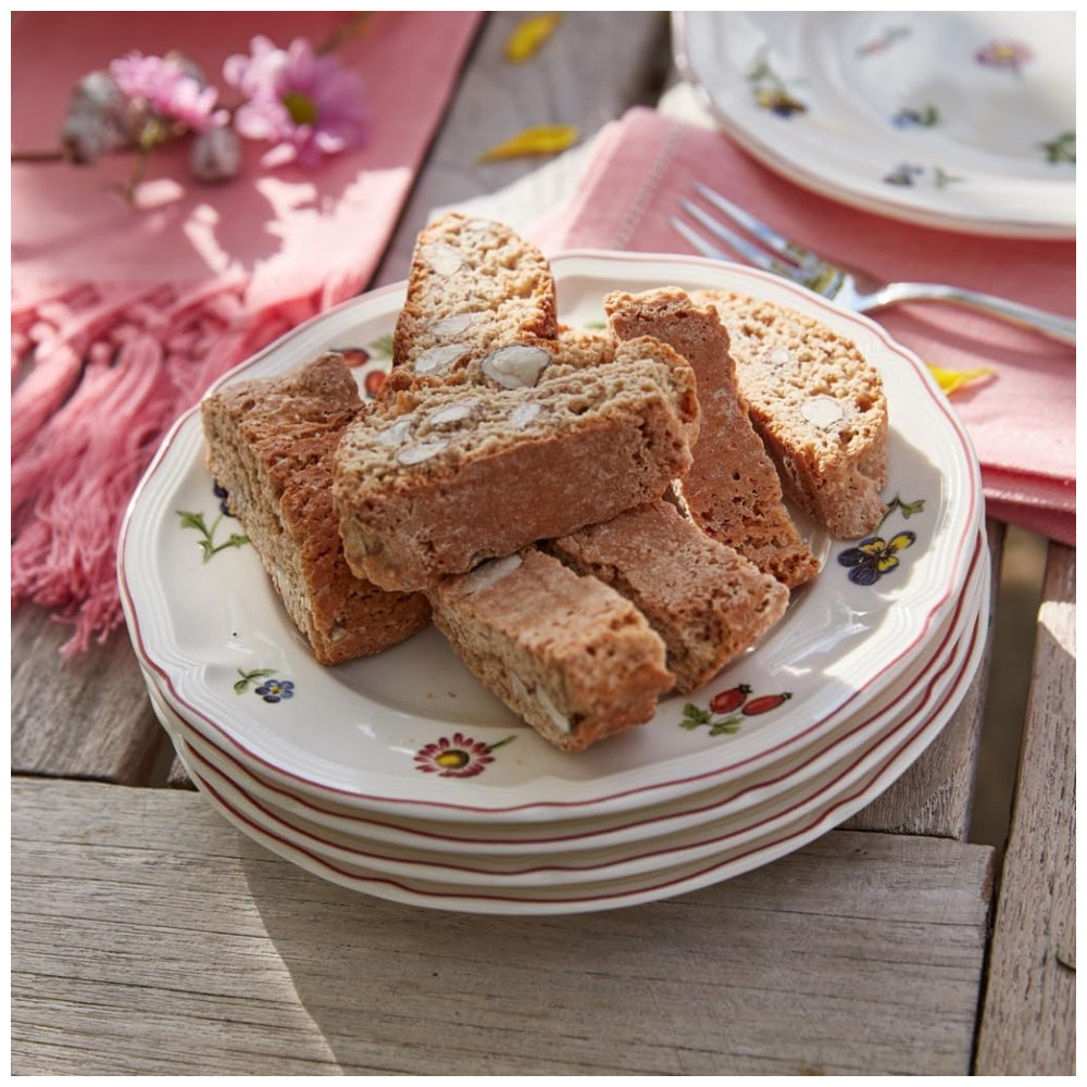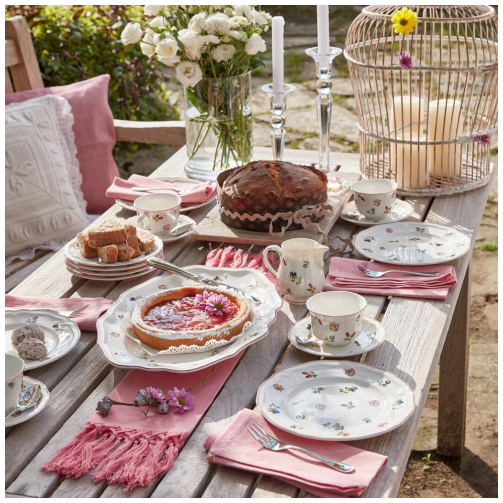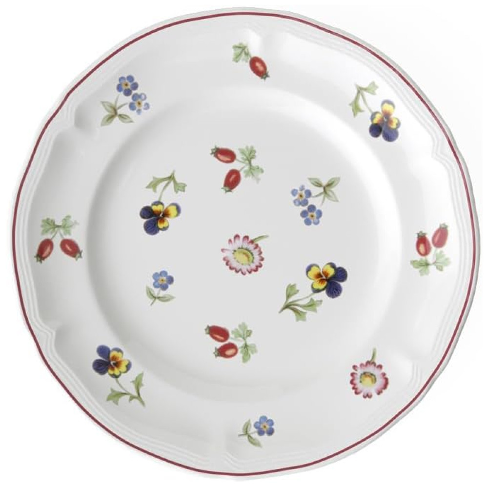 Feito na Alemanha e em Luxemburgo, o prato é produzido com porcelana vitrificada de alta qualidade, garantindo durabilidade e anos de uso. Sua superfície é adornada com um acabamento em vermelho fino e pequenas flores, uniformemente distribuídas, trazendo à sua mesa a sensação de uma tarde quente de primavera no interior da França.