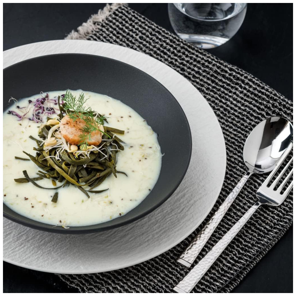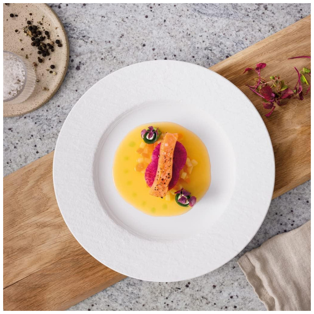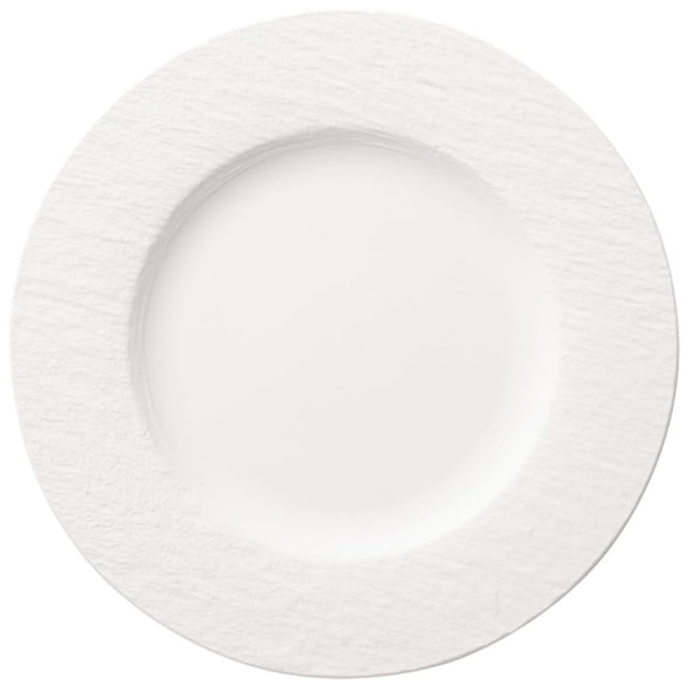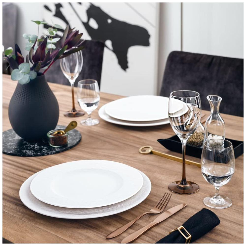 O conjunto inclui um prato de jantar Villeroy & Boch Manufacture Rock Blanc de 27 cm, feito de porcelana premium de alta qualidade na Alemanha, na elegante cor branca.