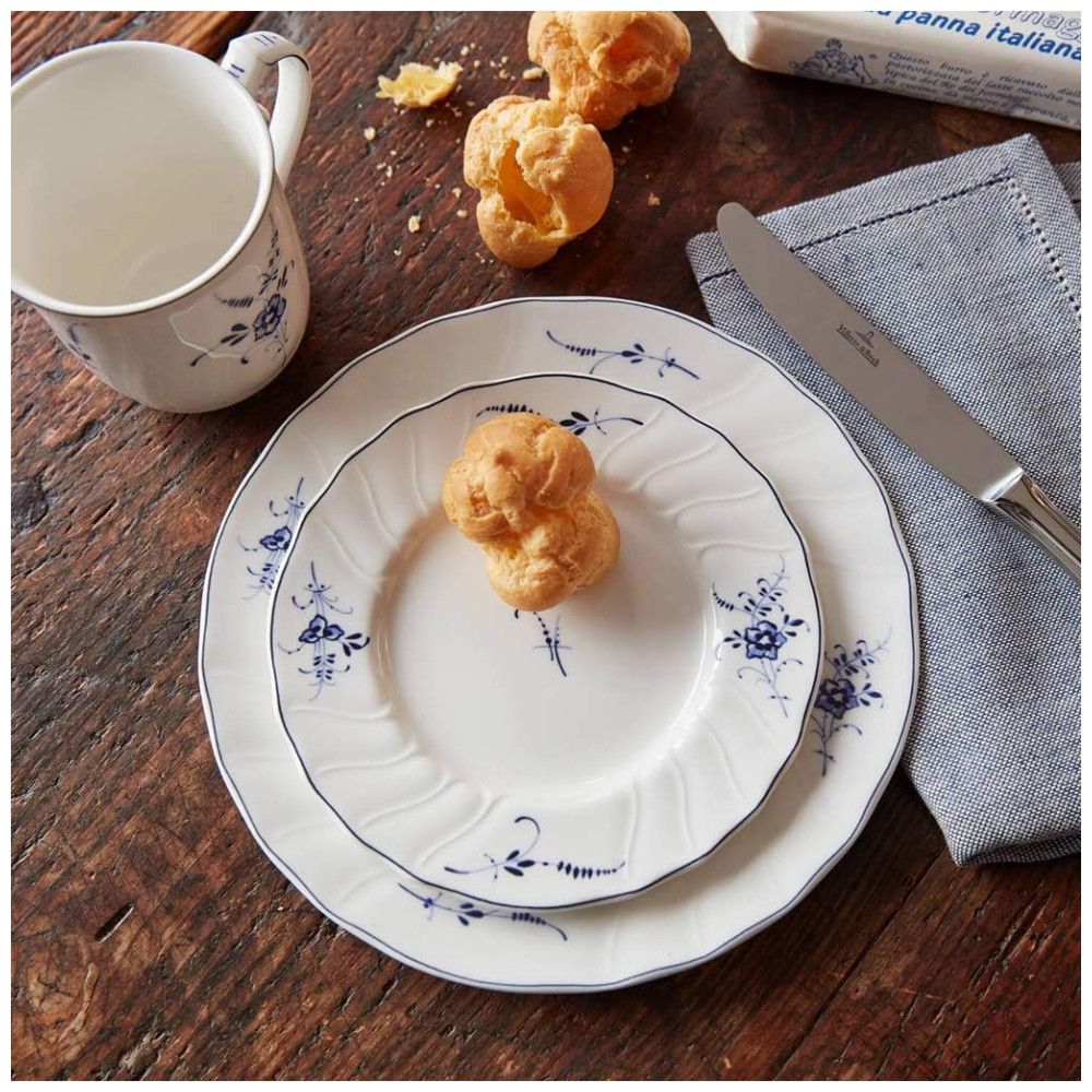 Feito de porcelana premium de alta qualidade e com 8 polegadas de diâmetro (20 cm), o prato é resistente e durável. Seu esmalte branco cremoso é complementado por uma linha fina em azul marinho na borda externa, criando um efeito orgânico e refinado. Importado da Alemanha, este padrão de porcelana foi introduzido em 1768 e continua a ser uma referência de elegância e tradição.