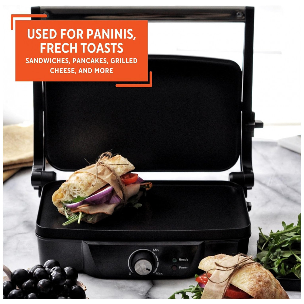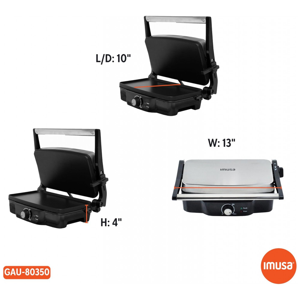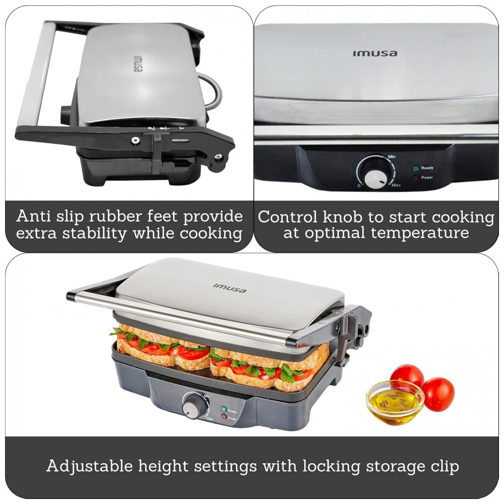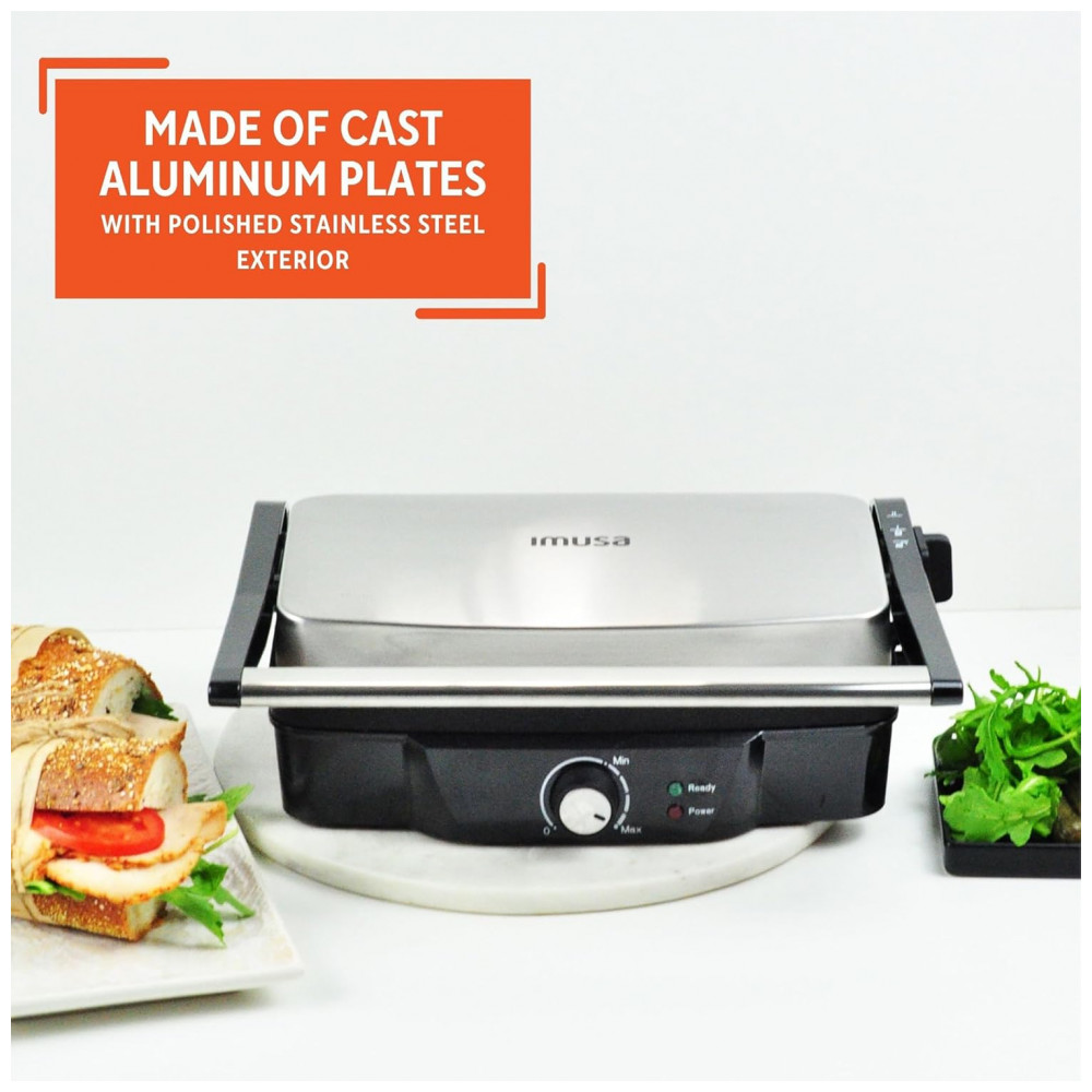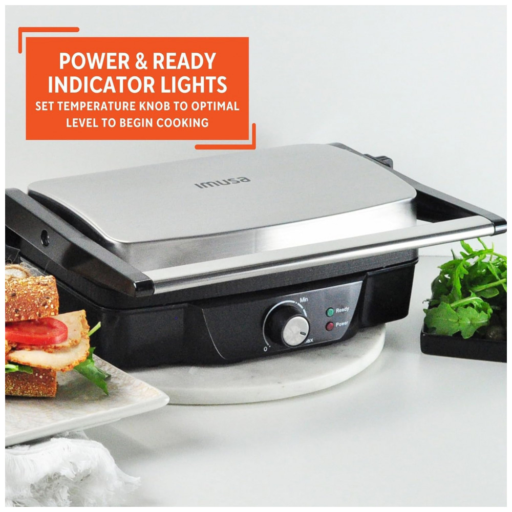Prensa de Panini Elétrica IMUSA em Aço Inoxidável com Controle de Temperatura Ajustável e Placas Antiaderentes 1200W Grande Antiaderente