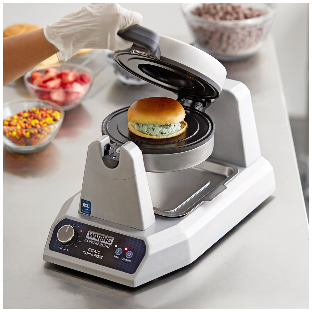 A prensa panini Waring WICSP180 para gelato e sorvete comercial processa gelato, sorvete duro, soft-serve ou iogurte congelado em sanduíches prensados com tempos de cozimento de 5-15 segundos. Com superfície de 18 x 43 cm e 1200W de potência, atende demandas elevadas em padarias, coffee shops, food trucks e quiosques, com rotação das placas e timer de 15s com sinal sonoro. Suporta também paninis variados como frango pesto ou café da manhã em uso medium duty.