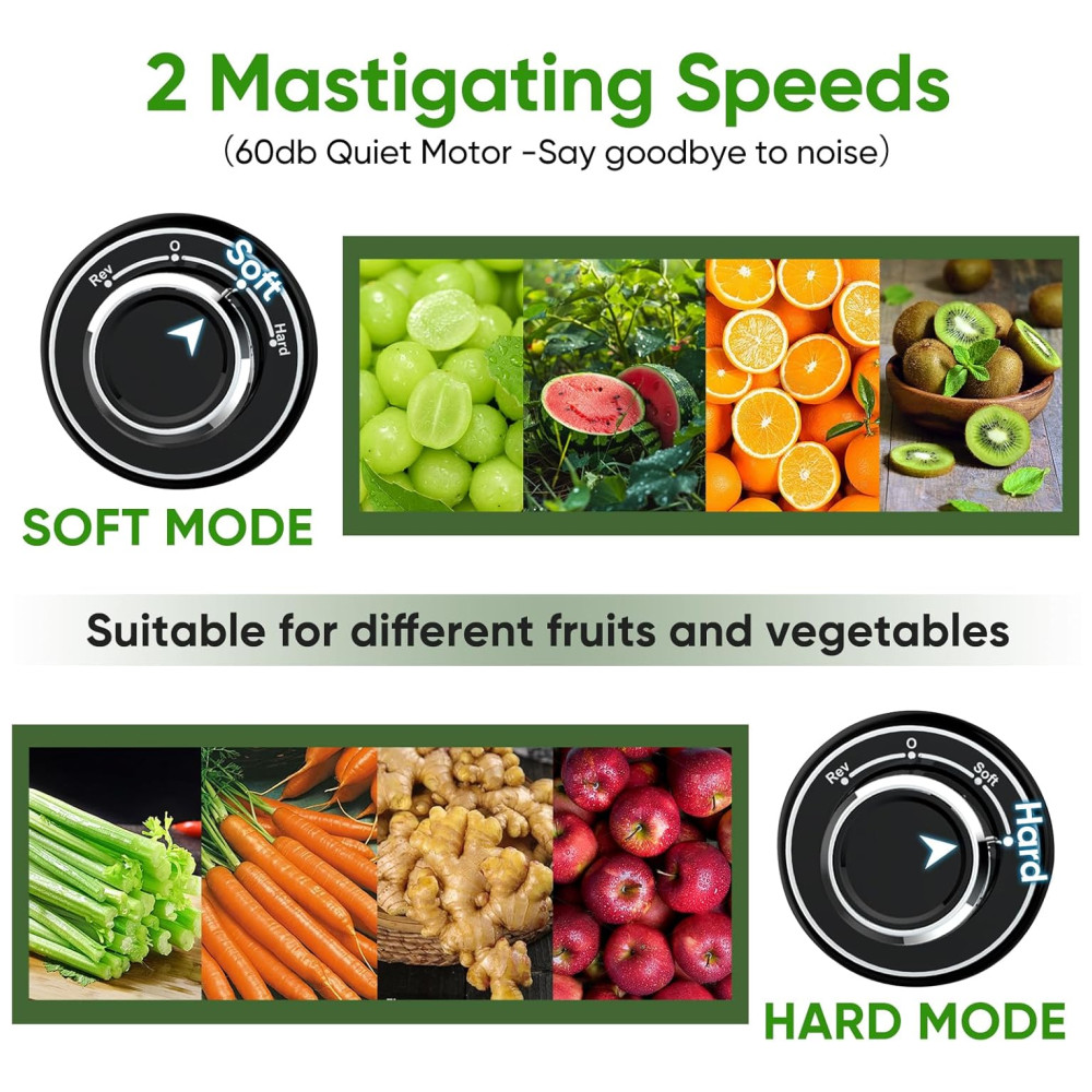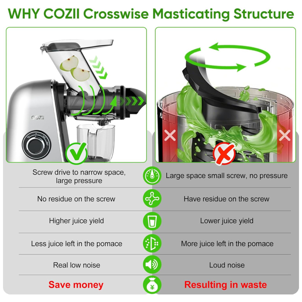 O extrator de suco COZII foi projetado para extrair sucos de frutas, vegetais e folhas verdes de forma delicada e completa, preservando nutrientes e sabor. Com a tecnologia de Prensagem a Frio, suas bebidas ficam ricas em nutrientes e sabor, sem o calor gerado por juicers tradicionais. Capaz de lidar com diversos vegetais e frutas, como romã, couve, maçã, abacaxi, cenoura, melancia, uva e muito mais. Operação segura e silenciosa, com proteção inteligente que desliga automaticamente a cada 20 minutos de uso. Design com abertura larga em forma de Y para evitar acidentes. Fácil de limpar, com peças destacáveis e seguras para lava-louças. Com componentes duráveis feitos com material de alta qualidade livre de BPA, o Juicer COZII é resistente e construído para durar. A malha filtrante de aço inoxidável e a carcaça de plástico reforçado garantem uma experiência de extração de sucos confiável e consistente.
