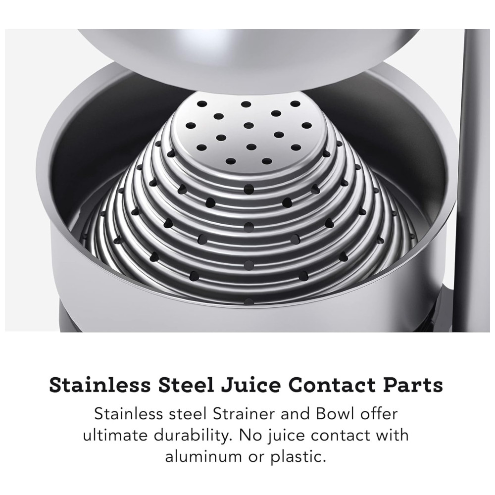 JUICER DE CITRINOS DE AÇO INOXIDÁVEL Este espremedor de frutas cítricas possui uma peneira e tigela de aço inoxidável para maior durabilidade Seu suco nunca entra em contato com alumínio ou plástico