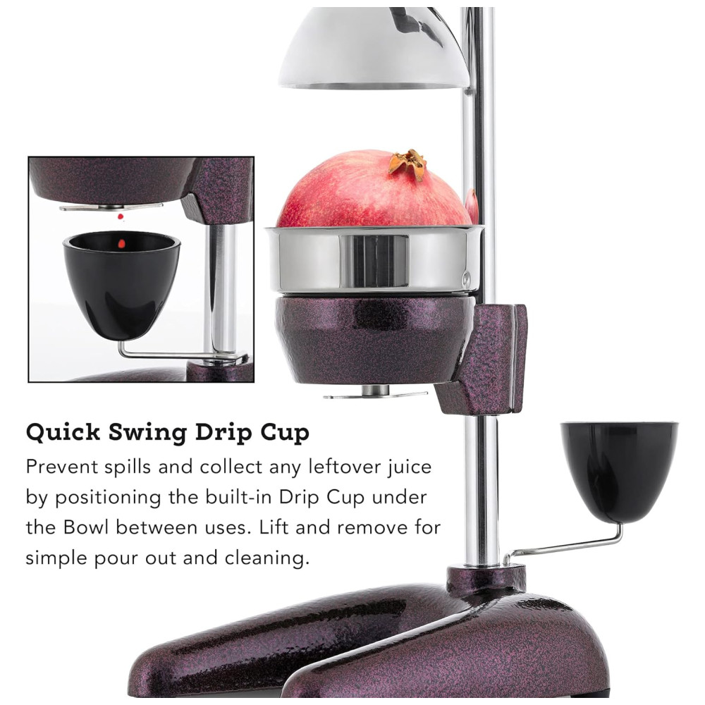 COPO DE Gotejamento SWING FÁCIL DE USAR Evite derramamentos e suco desperdiçado enquanto usa o copo de gotejamento embutido em nosso espremedor de mão entre as prensas Simplesmente levante, remova e despeje para limpar o copo