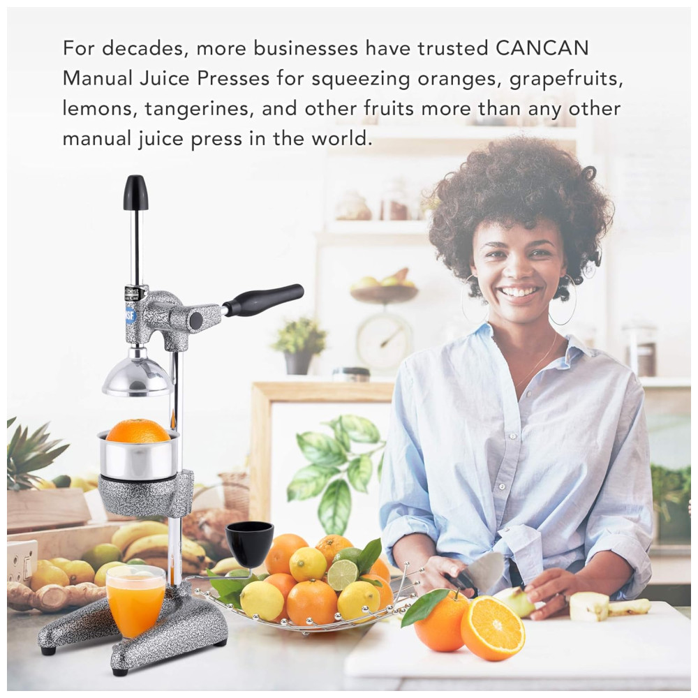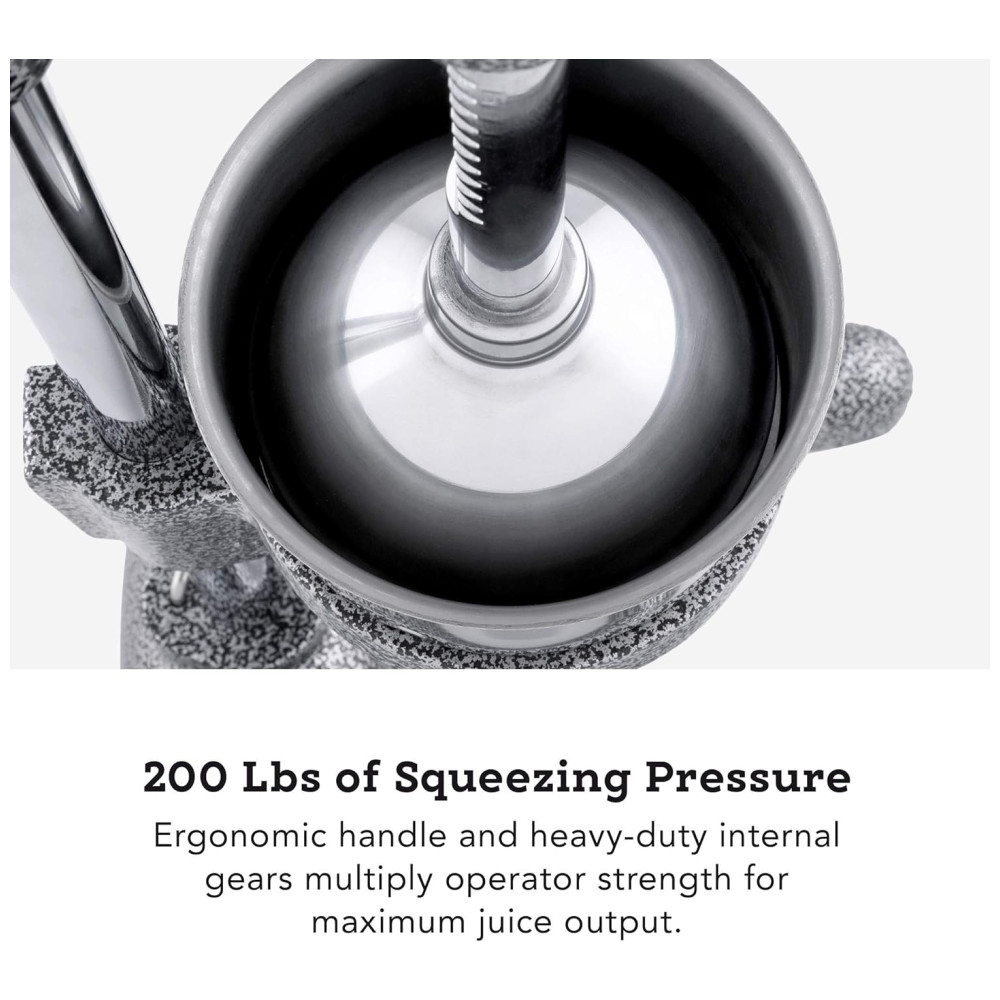 SAÍDA MÁXIMA DE SUCO Este espremedor manual, completo com alça ergonômica, produz 200 libras de pressão de compressão por meio de engrenagens internas resistentes projetadas para reduzir o desperdício, economizar tempo e aumentar a produção de sua prensa de suco