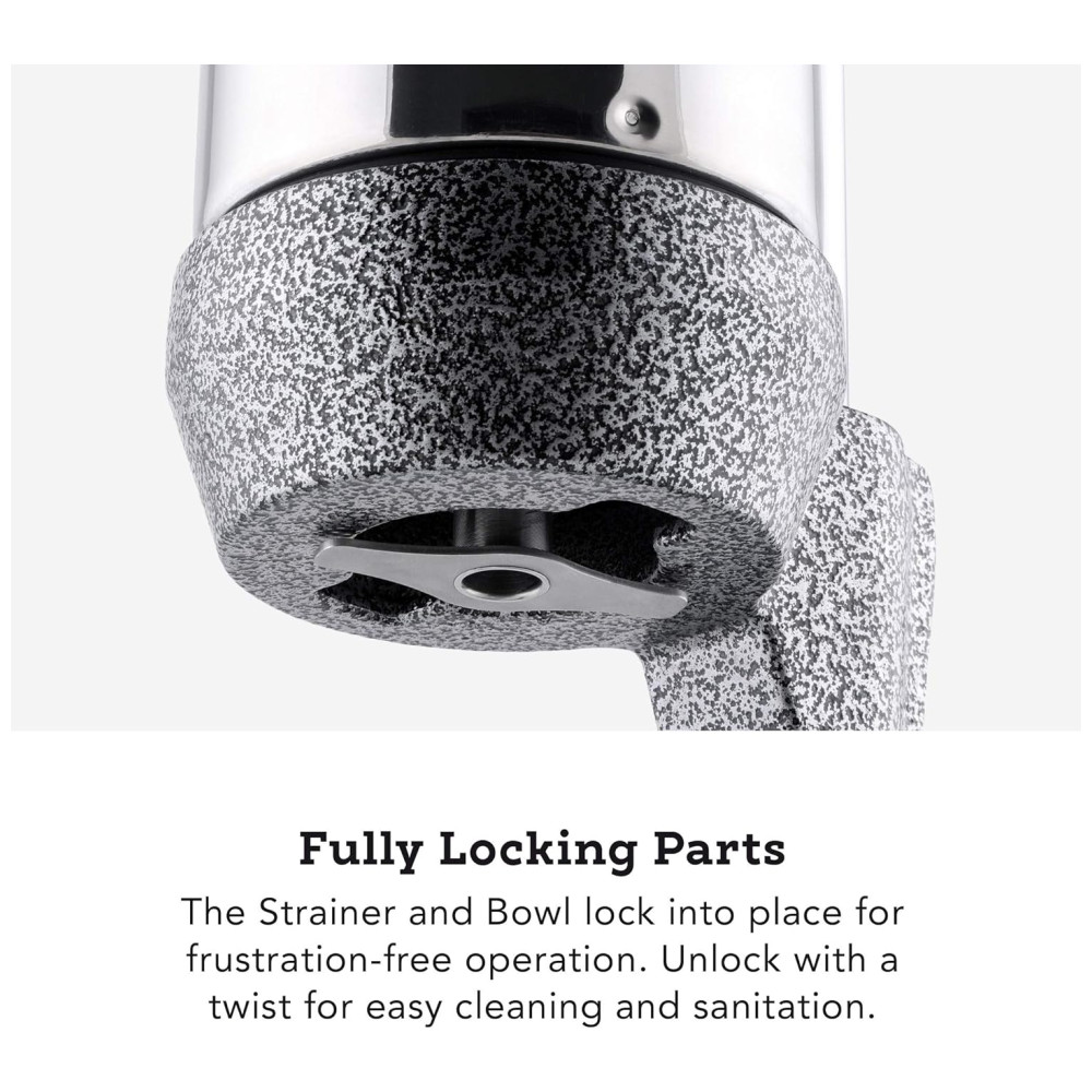 SUJO SEM FRUSTRAÇÃO Nosso espremedor de sucos a frio possui peças totalmente travadas o filtro de suco e a tigela são travados no lugar para maior facilidade de uso Basta desbloquear com um giro para limpar e higienizar rapidamente