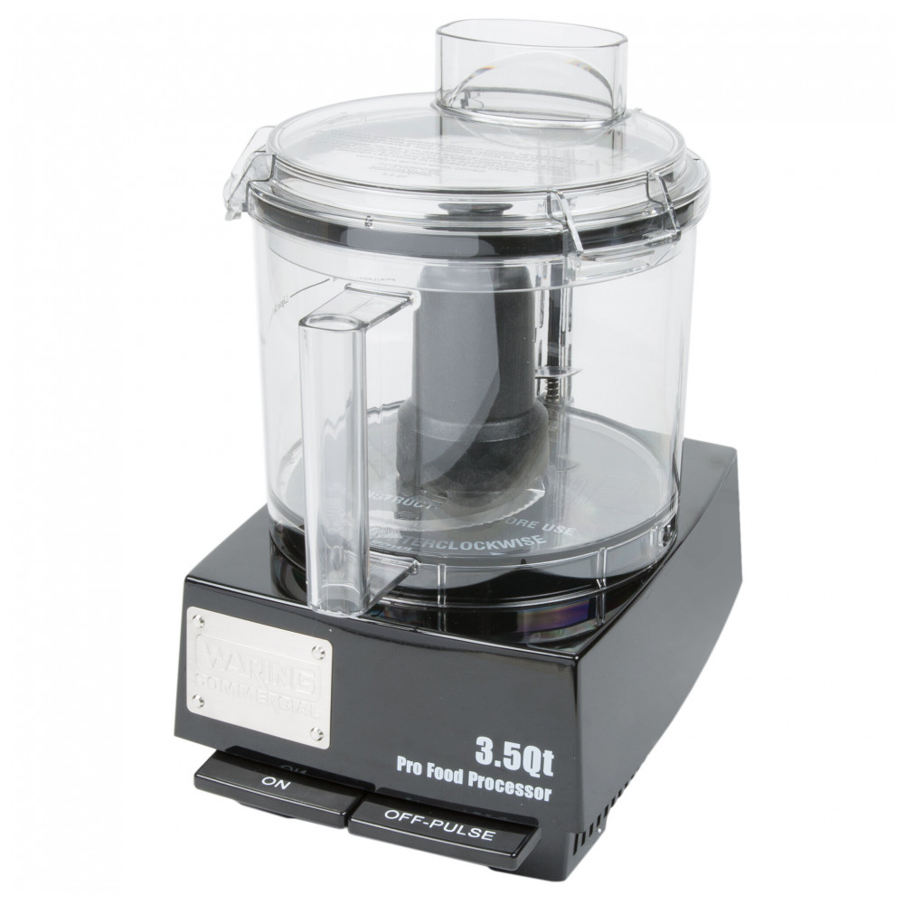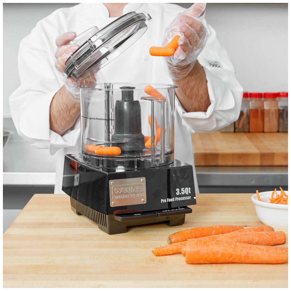 O processador de alimentos Waring WFP14SW, equipado com motor de 1,01 CV (720 W), processa picagem, trituração, purê e liquefação em tigela batch de 3,5 qt (3,3 L) para uso comercial intenso. Opera a 1780 RPM em velocidade única, amassando massas de pão ou torta e processando carnes em volumes elevados. Tigela de plástico transparente facilita monitoramento visual do processo.