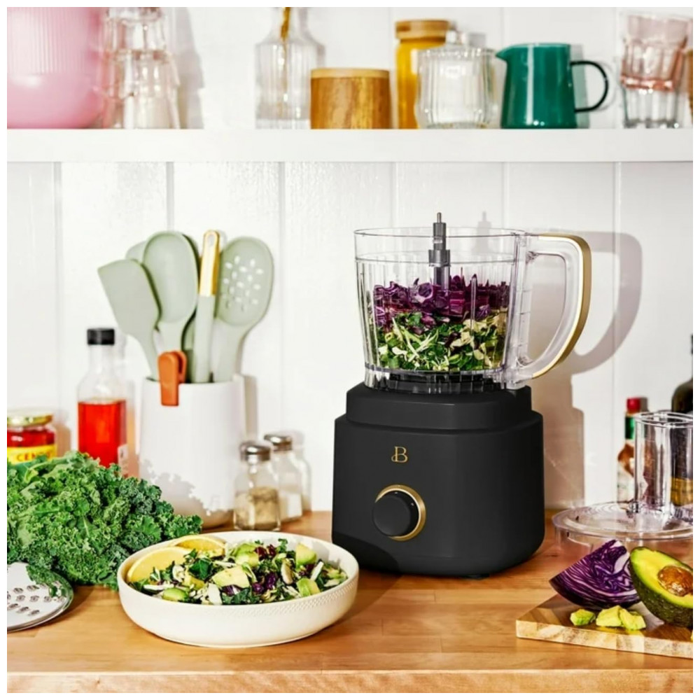 O controle de operação é feito por seletor de velocidade com três modos (baixa, alta e pulsar), permitindo ajustar o processamento ao tipo de preparo desejado. A tampa possui bocal de alimentação extralargo com largura aproximada de 7,6 cm, permitindo introduzir frutas e legumes com menos pré‑corte, conforme o formato dos ingredientes. O sistema de montagem utiliza encaixe twist‑and‑lock entre tigela e tampa, que precisa estar corretamente travado para liberação do funcionamento.