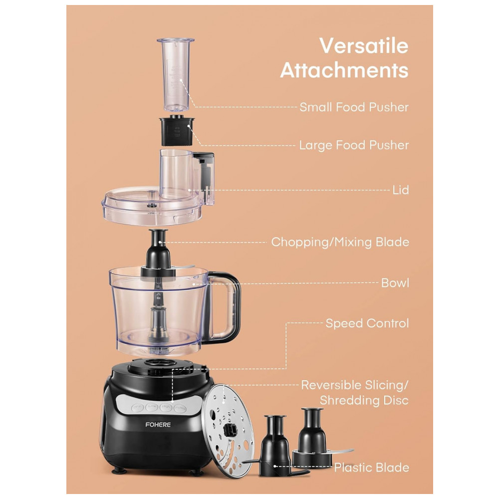 Processador de Alimentos 12 xícaras com 4 Velocidades e Acessórios 110V 500W FOHERE Preto