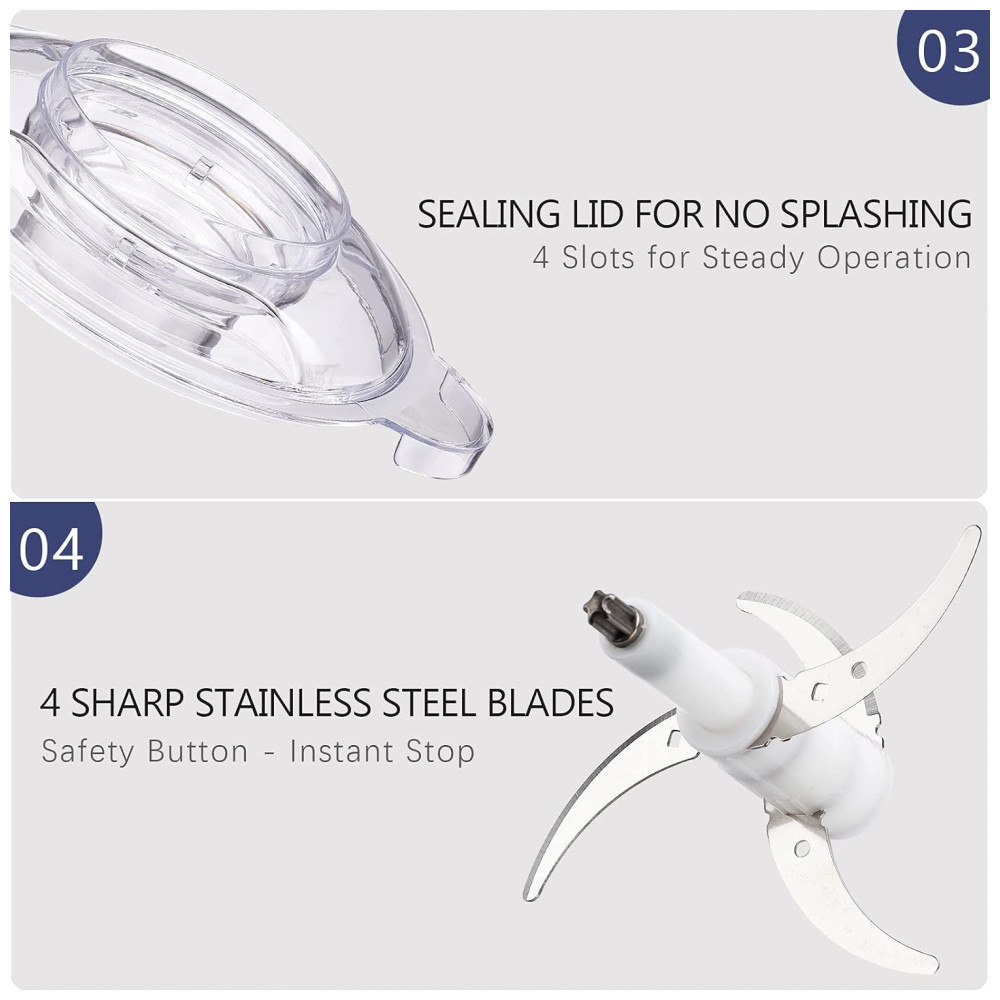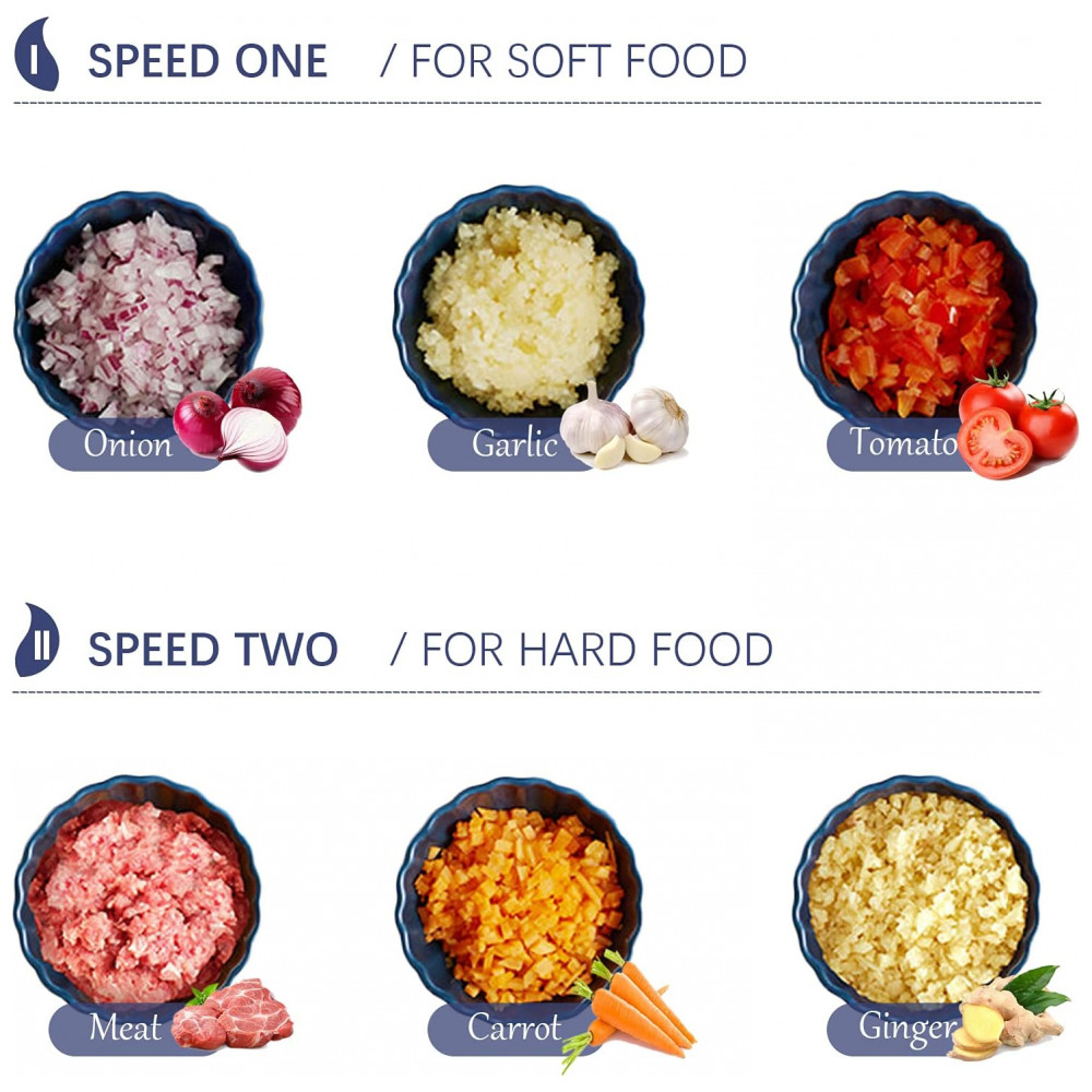 Desfrute de diferentes alimentos cortados com 2 velocidades A velocidade um combina com ingredientes como cebola, alho, salsa, gergelim e pimenta velocidade dois ternos para carne bovina, suína, nozes, smoothies e comida para bebês. Você pode descobrir o quão poderoso pode ser em sua cozinha.