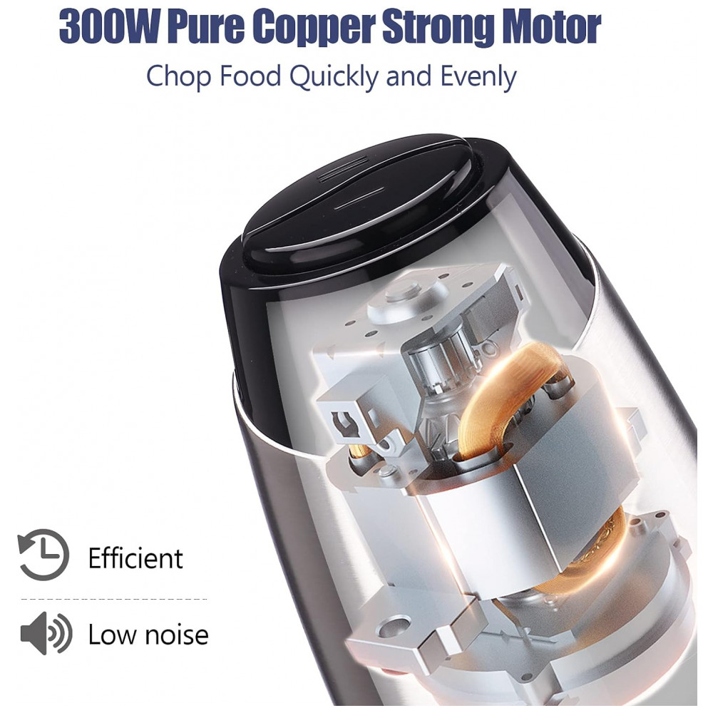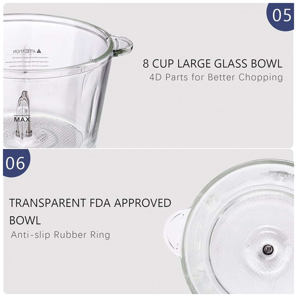 Desempenho poderoso e capacidade de 8 xícaras com motor de 300 W A tigela de vidro do processador de alimentos de 8 xícaras é adequada para a maioria das famílias. É grande o suficiente para lidar com várias tarefas, como cortar carne e legumes. Além disso, o motor de 300 W oferece um desempenho poderoso, perfeito para cortar ingredientes duros com eficiência.