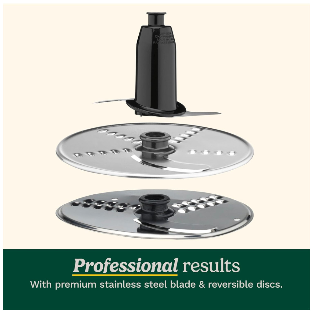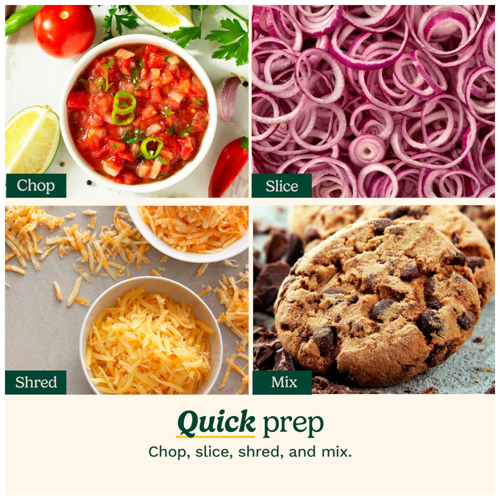 350 watts para um excelente desempenho na preparação de alimentos Tigela de trabalho de 8 xícaras com marcações de medição Discos de trituração e corte reversíveis médios a finos Tubo de alimentação integrado para adicionar ingredientes durante o processamento Peças removíveis e fáceis de limpar são laváveis na máquina de lavar louça