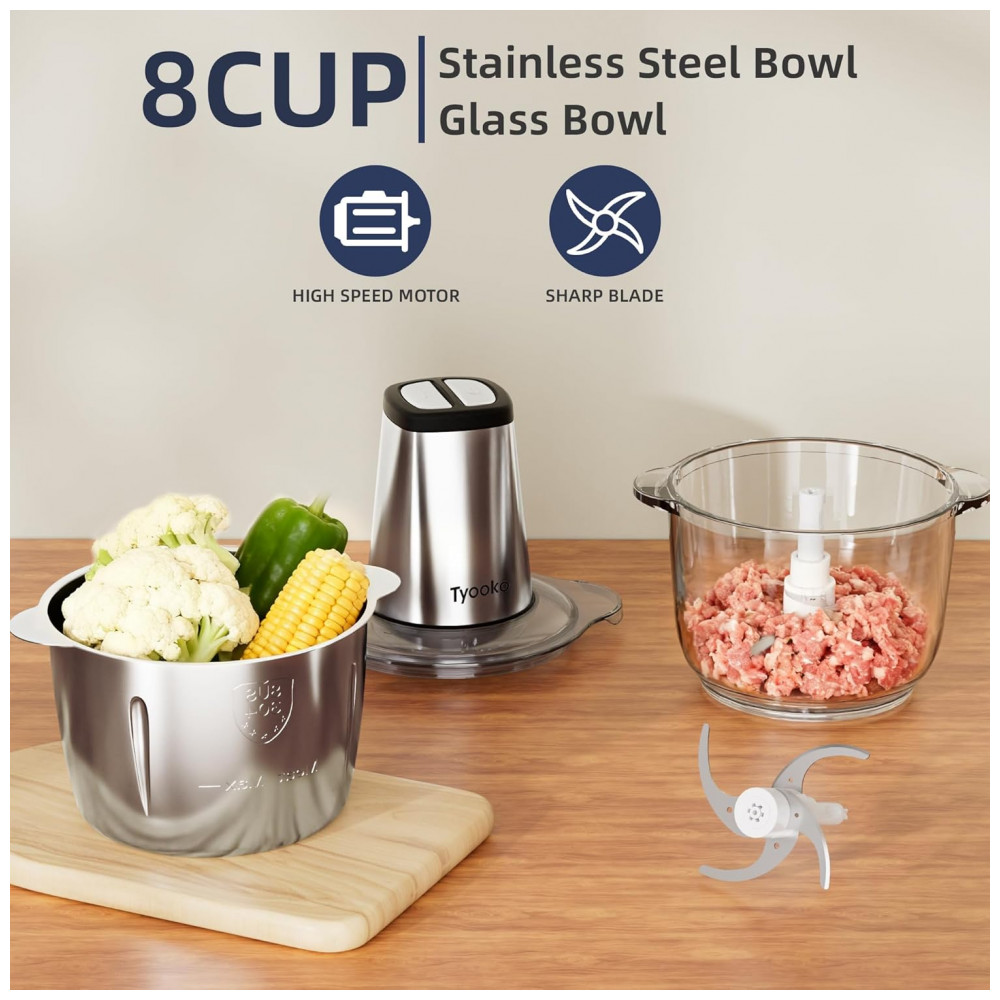 O processador de alimentos Tyooko JBJ01 é um picador elétrico de bancada com duas tigelas de 8 xícaras cada (aproximadamente 1,9 litro), uma em aço inoxidável e outra em vidro, indicado para carnes, legumes, frutas, nozes, peixes, alimentos para pets e papinhas. A configuração com dois bowls permite separar usos, mantendo, por exemplo, uma tigela para carnes e outra para vegetais, favorecendo higiene e organização no preparo.