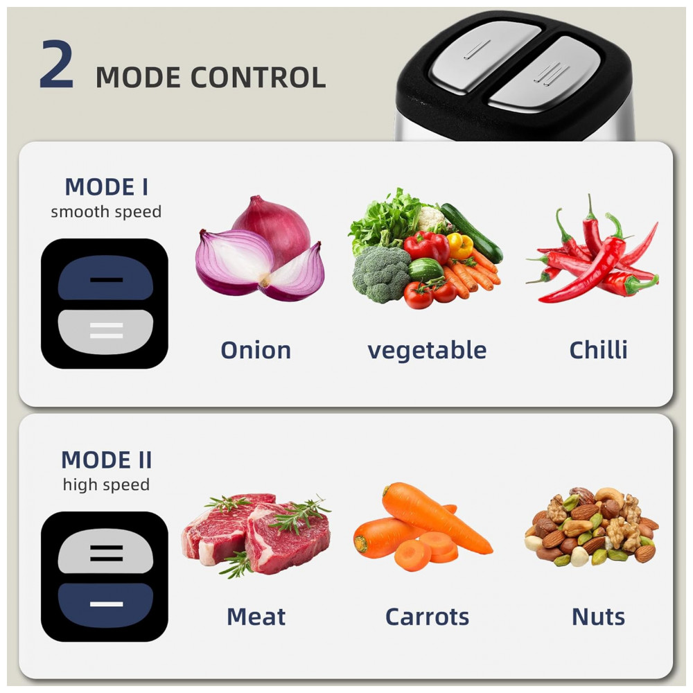 O motor em cobre foi projetado para triturar desde ingredientes macios até alimentos mais firmes, como carne bovina e suína, em dois níveis de velocidade: baixa para vegetais frescos e alta para carnes e nozes. O sistema de segurança com trava exige o correto alinhamento entre motor, lâmina e tampa para funcionamento, interrompendo o giro das lâminas imediatamente quando o conjunto é desacoplado.