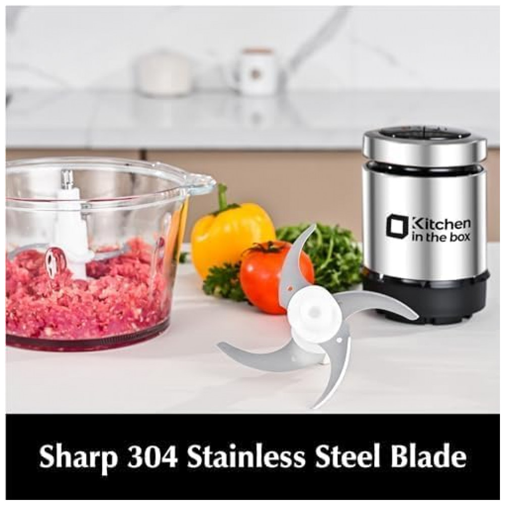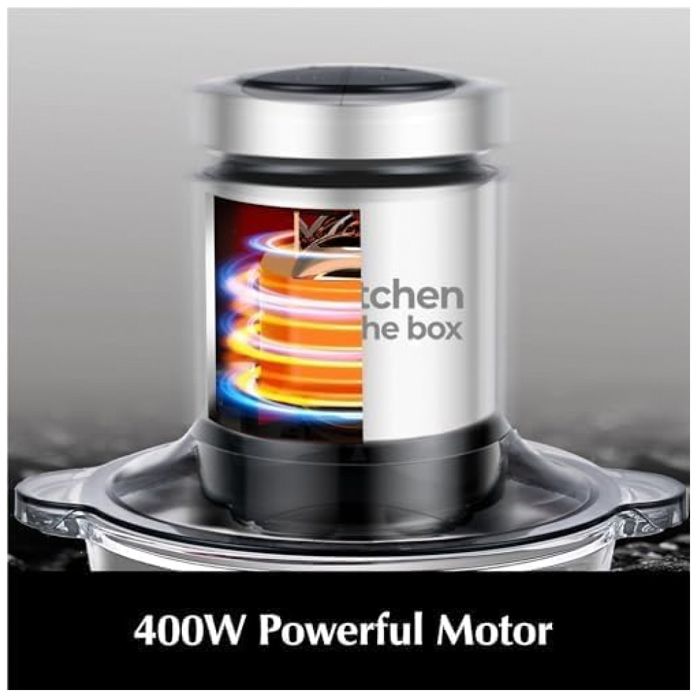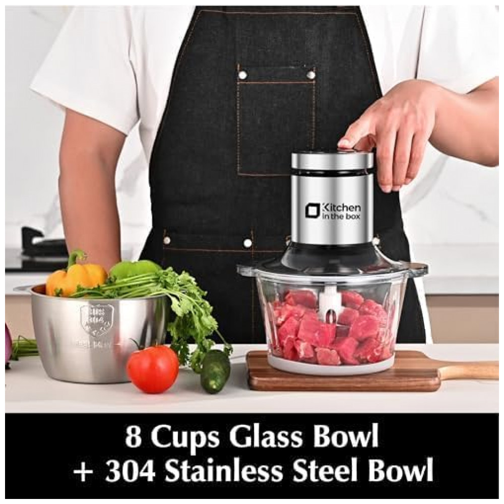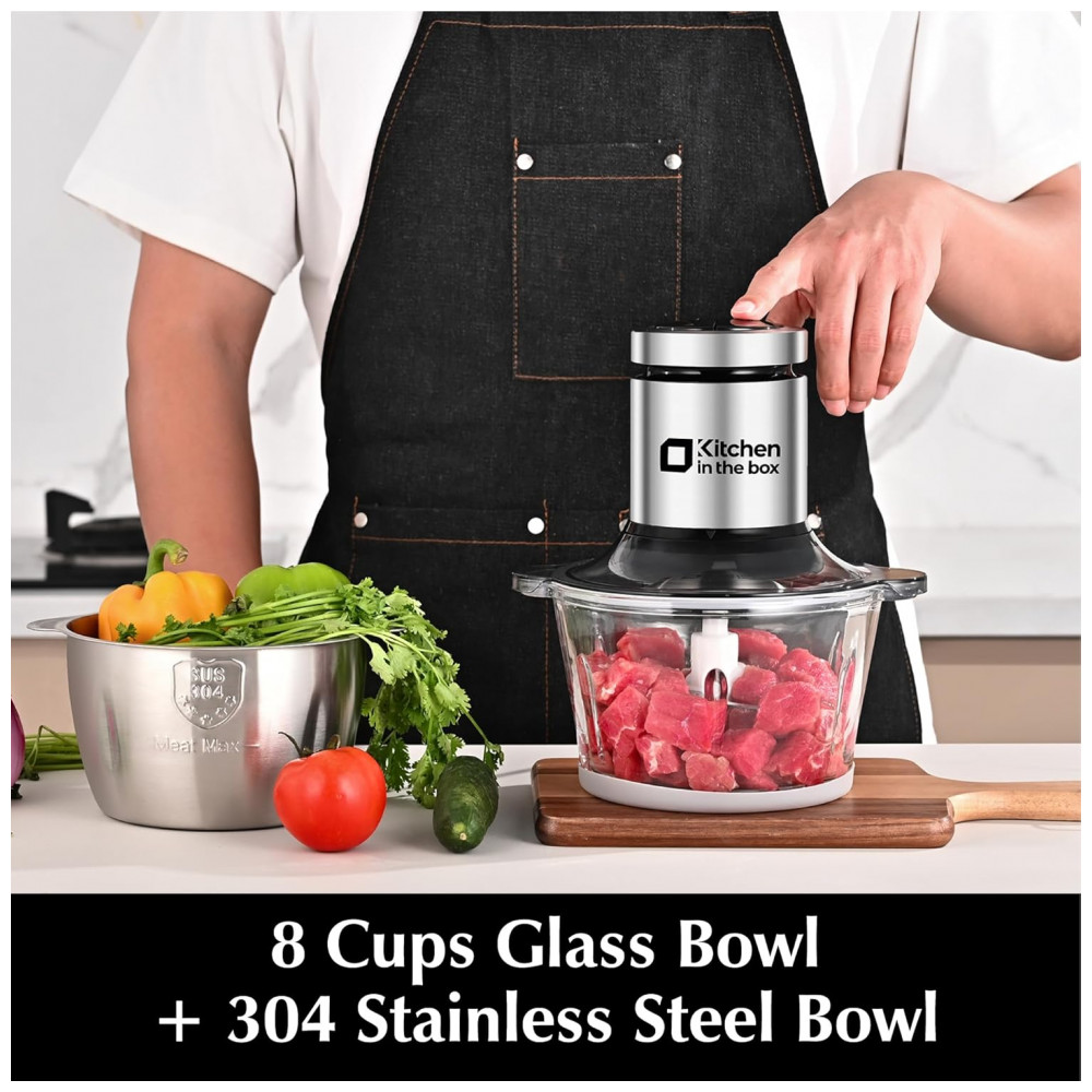 O processador de alimentos Kitchen in the box MG01 (versão botão preto) é um equipamento compacto com duas tigelas de aproximadamente 2 litros cada, uma em vidro e outra em aço inoxidável, voltado para picar, triturar e misturar diferentes tipos de alimentos. O motor de 400W com enrolamento em cobre e proteção contra superaquecimento foi projetado para trabalhar em duas velocidades, permitindo ajustar a intensidade conforme a textura do ingrediente. A configuração com duas tigelas separadas favorece a higiene, possibilitando destinar o bowl inox para carnes e o de vidro para vegetais, frutas ou papinhas.