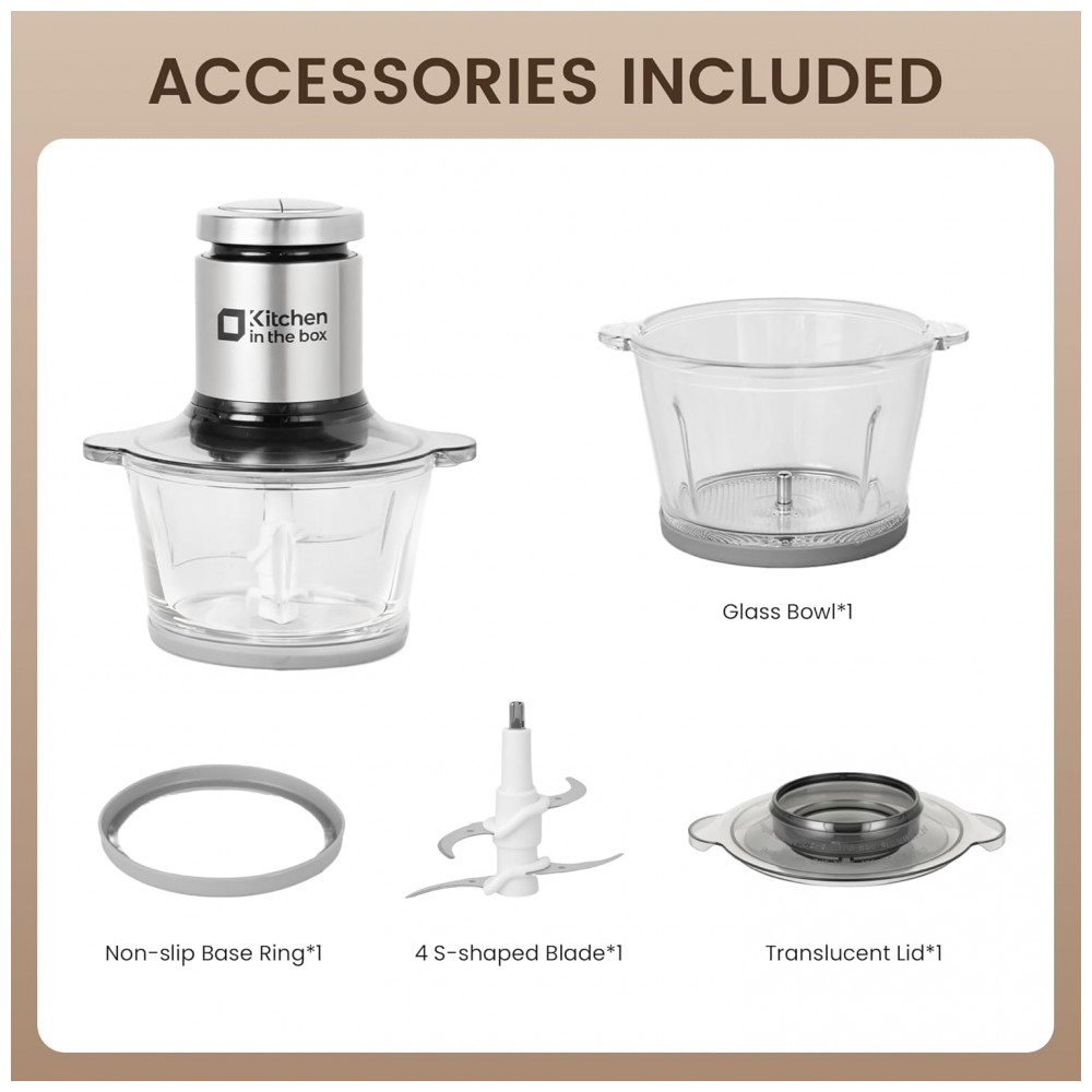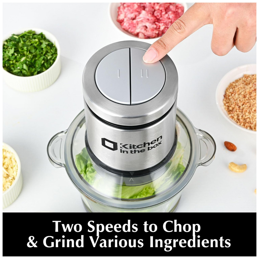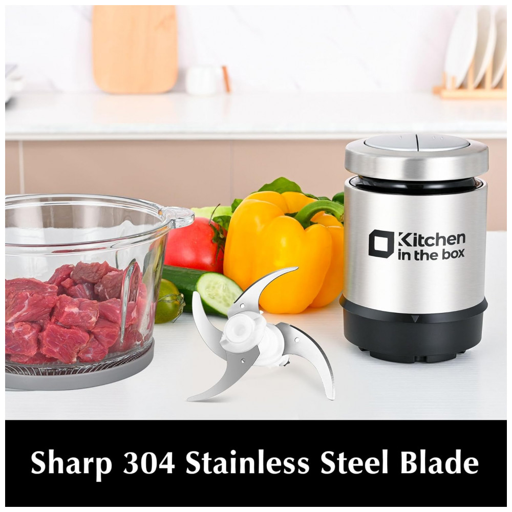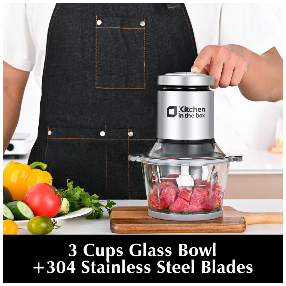 O mini processador de alimentos Kitchen in the box MG01 é um equipamento compacto com tigela de vidro de aproximadamente 1 litro (equivalente a 3 xícaras), indicado para picar, triturar e misturar pequenas porções de carne, legumes, frutas, nozes e papinhas. O motor de 400W com enrolamento em cobre e proteção contra superaquecimento trabalha em duas velocidades, permitindo alternar entre cortes mais delicados em velocidade baixa e trituração mais intensa em velocidade alta. A base com tapete antiderrapante ajuda a manter o conjunto estável sobre a bancada durante o uso.