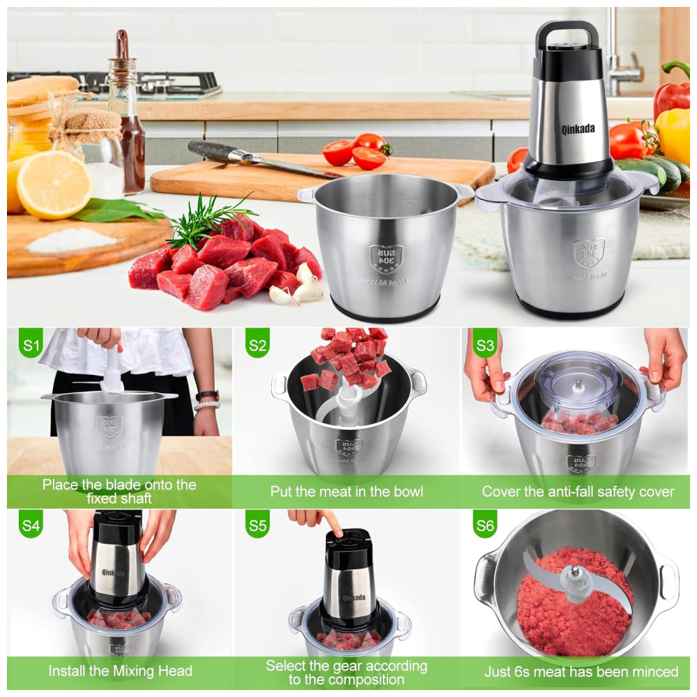 Motor potente de 500 W e corte rápido: com o motor potente de 500 W e 4 lâminas afiadas de dois níveis, o picador de carne elétrico Qinkada pode esmagar todos os tipos de ingredientes com facilidade e rapidez.