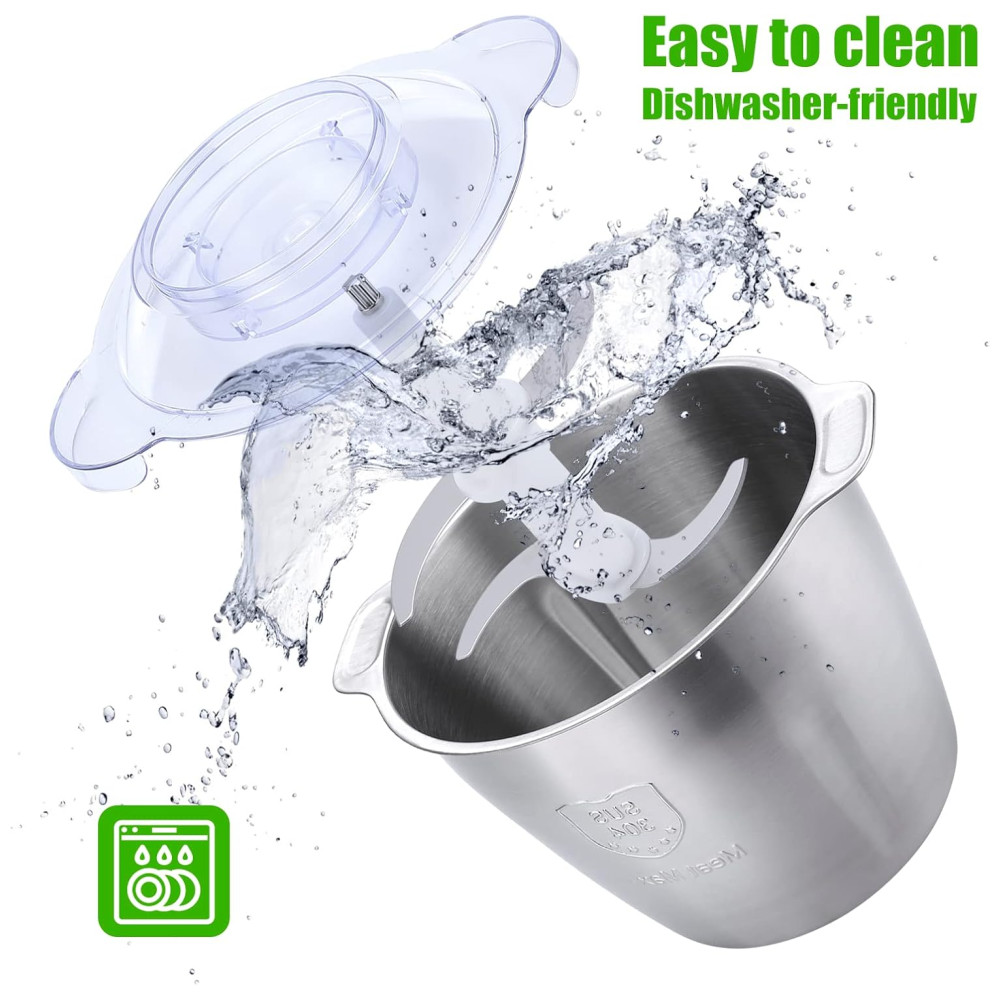 Design amigável: o moedor de carne é equipado com almofadas de borracha antiderrapantes para estabilidade durante o trabalho de alta eficiência. 2 tigelas de aço inoxidável são fáceis de limpar e lavar a tigela facilmente na máquina de lavar louça.