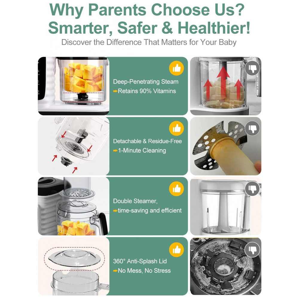 Fácil de limpar fabricante de alimentos para bebês Design de tanque de água de aço inoxidável de grande calibre, para facilitar a limpeza, sem ferrugem, lâmina removível para limpeza mais completa, liquidificador de purê com limpeza automática, O design amigável ajuda as mães ocupadas a economizar tempo. A fabricante de alimentos precisa ser mantida seca após a limpeza
