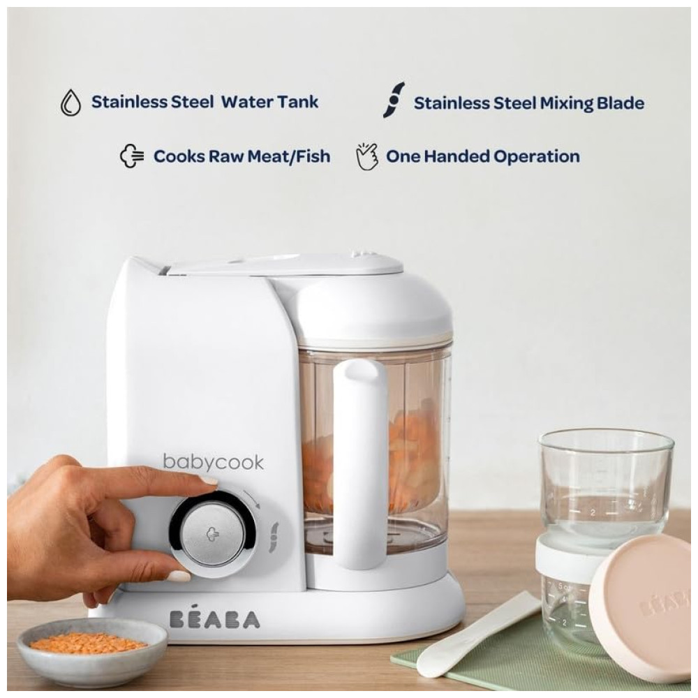 O vapor cozinha frango cru, peixe, frutas ou vegetais em qualquer estágio da comida do bebê e da criança em menos de 20 minutos. Função 4 em 1 cozinheiros a vapor, misturas, descongelar, aquece alimentos saudáveis . O recurso exclusivo de mesclagem permite controlar a consistência do purê fino ao robusto.