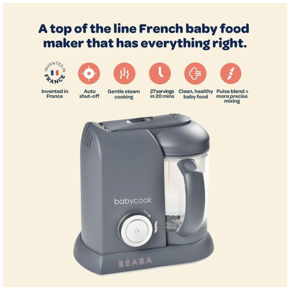 Leve à geladeira ou congele as sobras, depois simplesmente descongele e reaqueça no babycook. O cozimento a vapor contém vitaminas e nutrientes, uma lâmina de mistura multifuncional fornece a textura certa, o cronômetro tem um alerta sonoro para avisar quando as refeições estão prontas e tudo isso com operação total com uma mão. Este aparelho é carregado com recursos que tornam qualquer pai um profissional em comida de bebê. Prepare frutas, vegetais, carne ou peixe cru a qualquer estágio de comida para bebês e crianças em 15 minutos Operação única com uma mão Sistema de aquecimento a vapor patenteado Uma tigela grande de 4,5 xícaras com marcações de graduação Pegada estreita e cordão removível para fácil zenamento Espátula, tampa de mistura , filtro de smoothie e receita , livreto de menu incluído Reservatório de água de aço inoxidável Sem BPA, chumbo e ftalato .Projetado na França O que é ótimo sobre o Babycook Refeições saudáveis a vapor patenteado. Preserva vitaminas e minerais. A cesta de vapor separa os alimentos do líquido fervente. Fácil de usar operação com uma mão. Abrir e fechar com um toque. Desligamento automático e bipe quando concluído. Grande capacidade, 18 porções de comida para bebê de cada vez. Mais de 4,5 xícaras de capacidade. Vapor, misturar, descongelar tudo em um sistema. Frango e batata em 15 minutos, de crus a cozidos e puré. Faça qualquer estágio de comida para bebês. Faça sopas, purês, vegetais cozidos no vapor, molho de maçã e muito mais para o resto da família