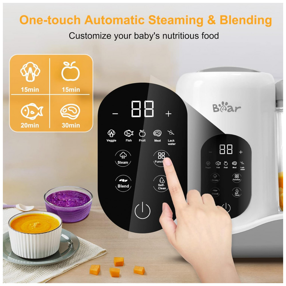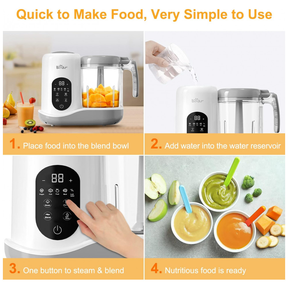 Bear processador de alimentos é um vaporizador e liquidificador em um único dispositivo, sem necessidade de cesta de plástico. Não há necessidade de mover ingredientes, não há mais equipamentos separados. Não há necessidade de lavar acessórios redundantes com água, mais ecológicos. O ciclo único de cozimento a vapor retém nutrientes, sabores e vitaminas, garantindo que seu filho se beneficie de comida caseira saborosa e saudável.