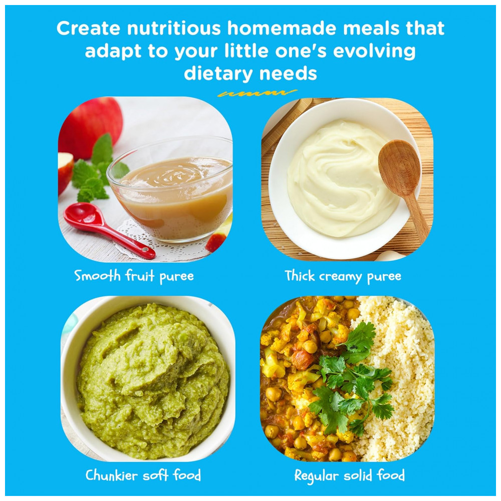 SAIBA EXATAMENTE O QUE VOCÊ ESTÁ ALIMENTANDO SEU PEQUENO Nosso ciclo de vaporização exclusivo retém nutrientes, sabores e vitaminas, garantindo que seu filho se beneficie de comida caseira saborosa e saudável. O moderno painel de controle com tela sensível ao toque permite que você selecione facilmente a consistência precisa da refeição, de purês a sólidos. ADEQUADO PARA TODOS OS VEGETAIS, FRUTAS, CARNE, FRANGO E PEIXE