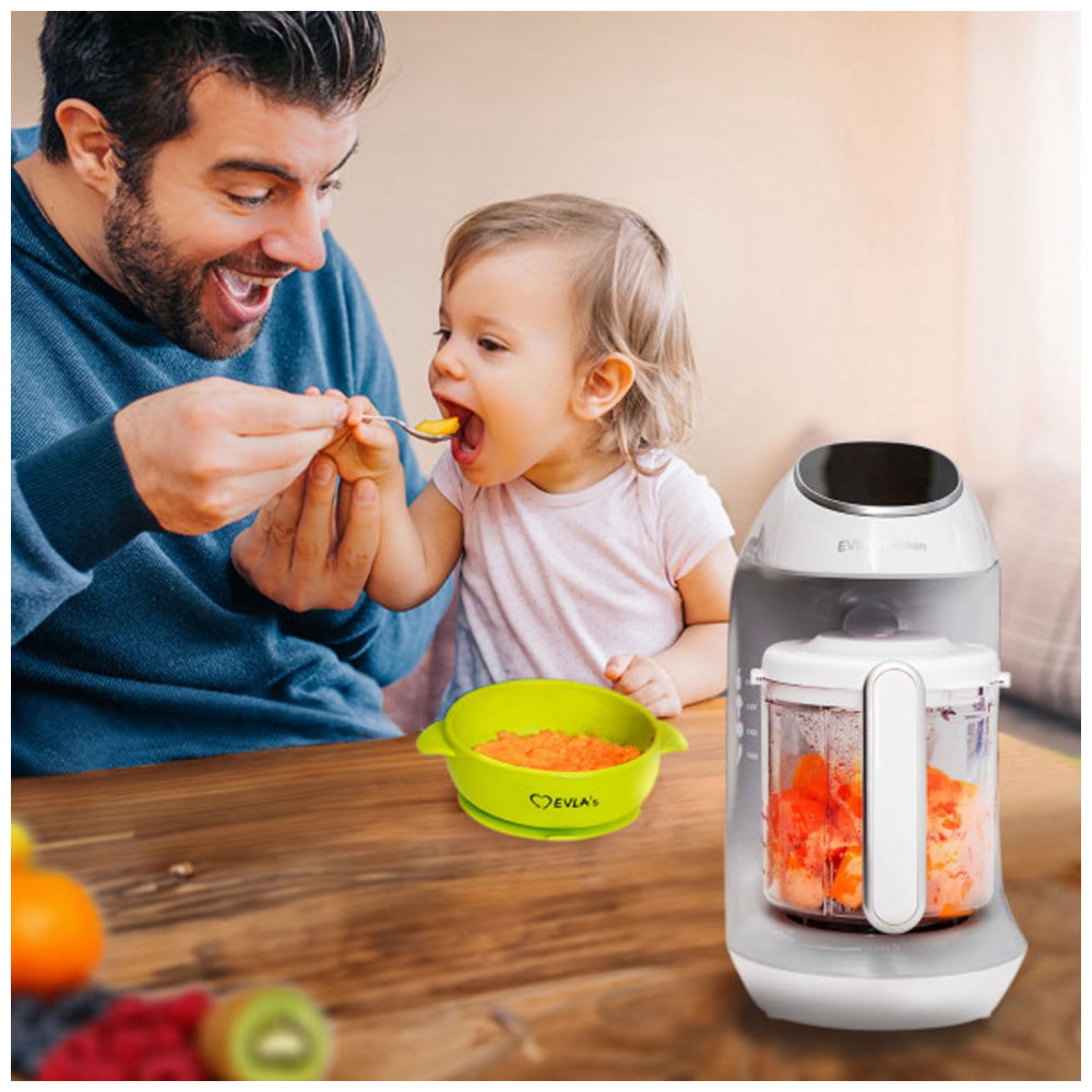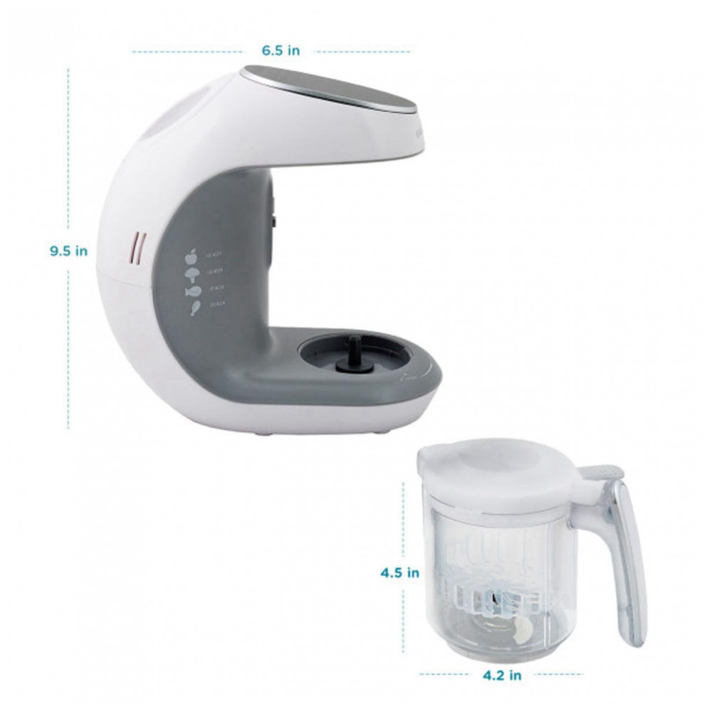 SAIBA EXATAMENTE O QUE VOCÊ ESTÁ ALIMENTANDO SEU PEQUENO Nosso ciclo de vaporização exclusivo retém nutrientes, sabores e vitaminas, garantindo que seu filho se beneficie de comida caseira saborosa e saudável. O moderno painel de controle com tela sensível ao toque permite que você selecione facilmente a consistência precisa da refeição, de purês a sólidos. ADEQUADO PARA TODOS OS VEGETAIS, FRUTAS, CARNE, FRANGO E PEIXE