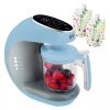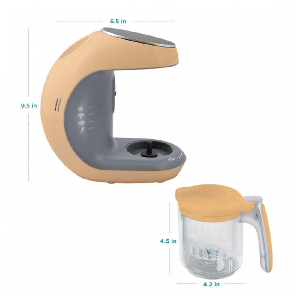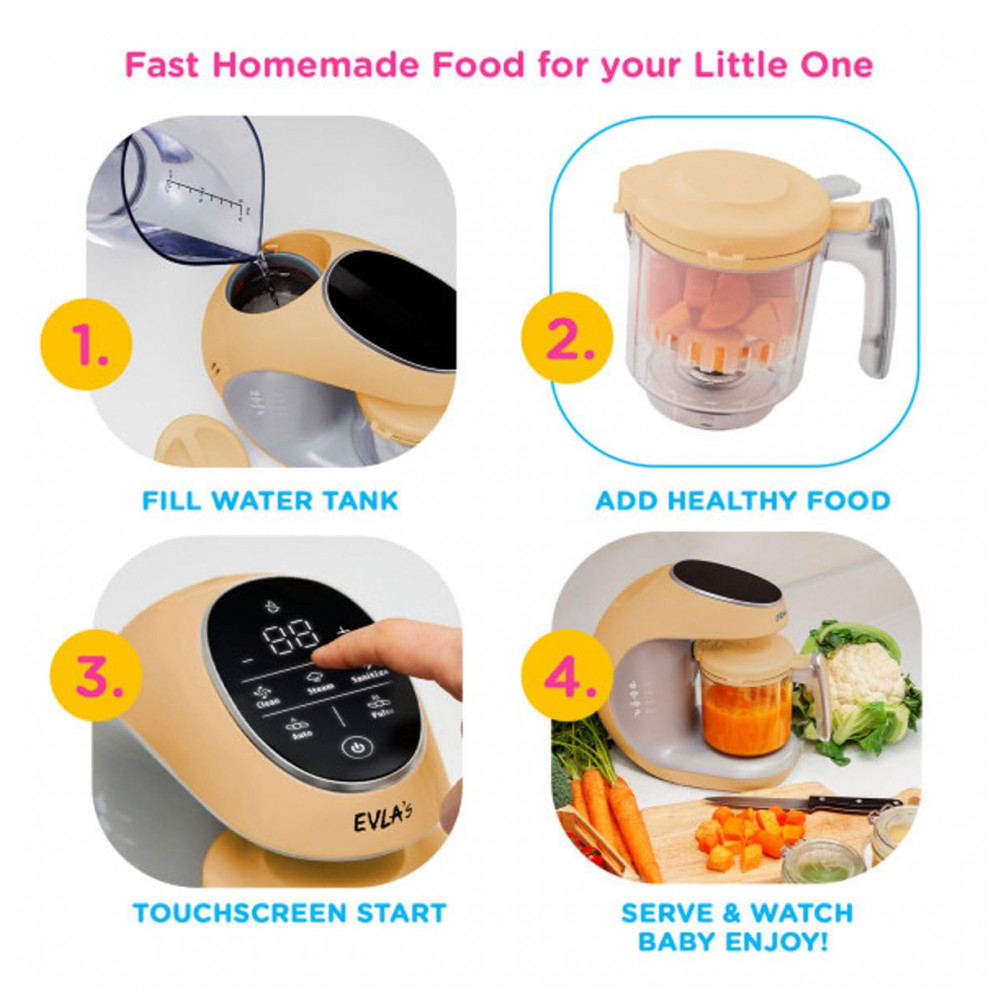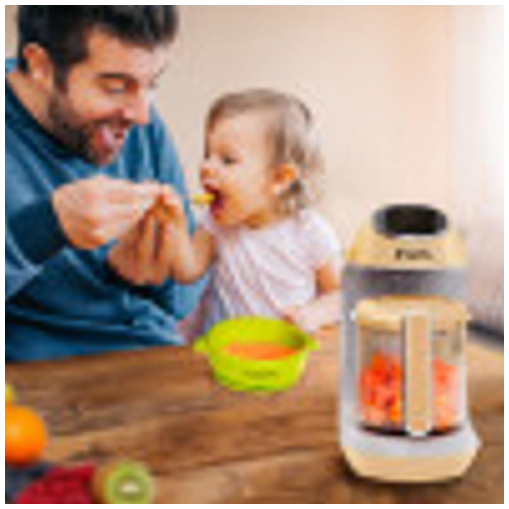 SAIBA EXATAMENTE O QUE VOCÊ ESTÁ ALIMENTANDO SEU PEQUENO Nosso ciclo de vaporização exclusivo retém nutrientes, sabores e vitaminas, garantindo que seu filho se beneficie de comida caseira saborosa e saudável. O moderno painel de controle com tela sensível ao toque permite que você selecione facilmente a consistência precisa da refeição, de purês a sólidos. ADEQUADO PARA TODOS OS VEGETAIS, FRUTAS, CARNE, FRANGO E PEIXE