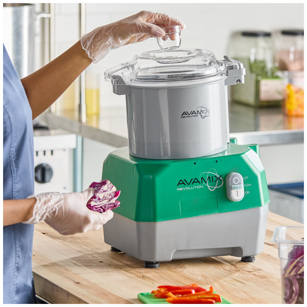O AvaMix Revolution BFP34GY é um processador de alimentos com tigela de plástico cinza de 3 qt (2,8 L) e motor de 1.01 CV, projetado para preparo em lotes de frutas, vegetais, molhos e sopas em operações comerciais. Possui lâmina e eixo de motor em aço inoxidável, base com pés antiderrapantes e design compacto para bancadas limitadas.