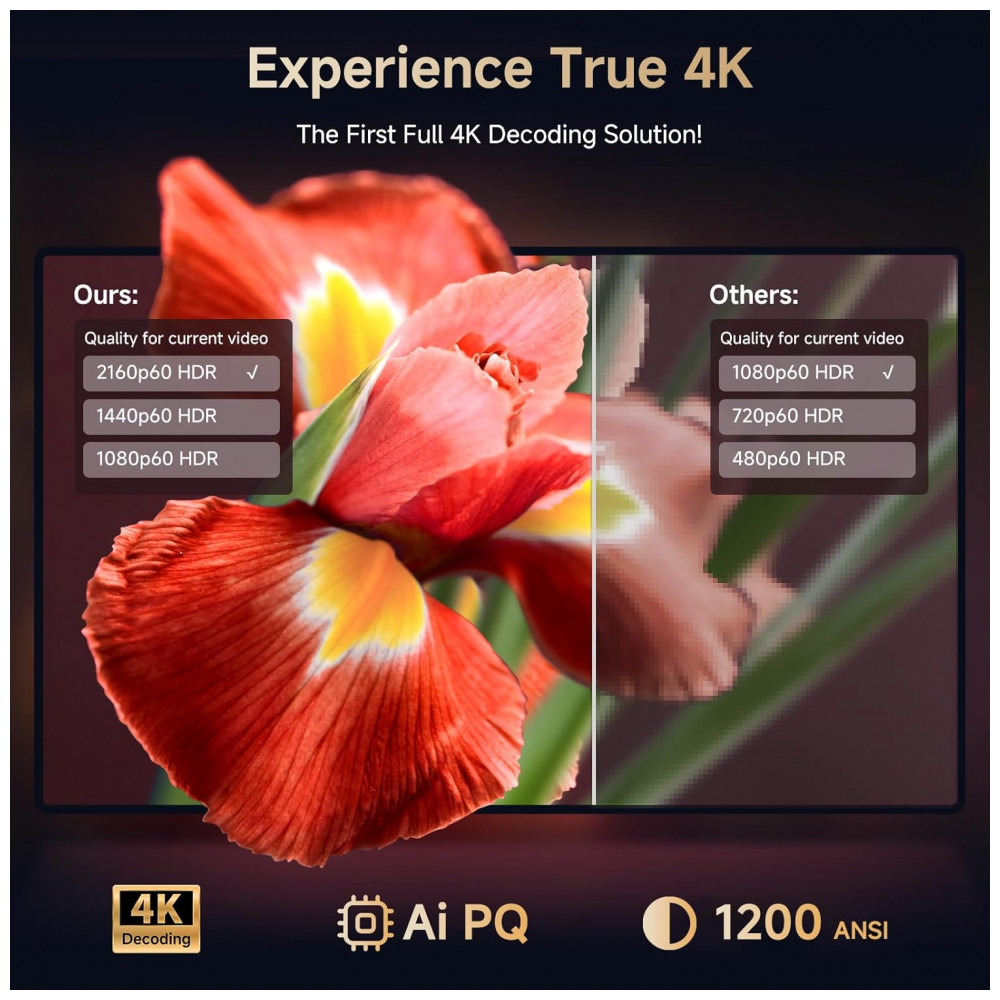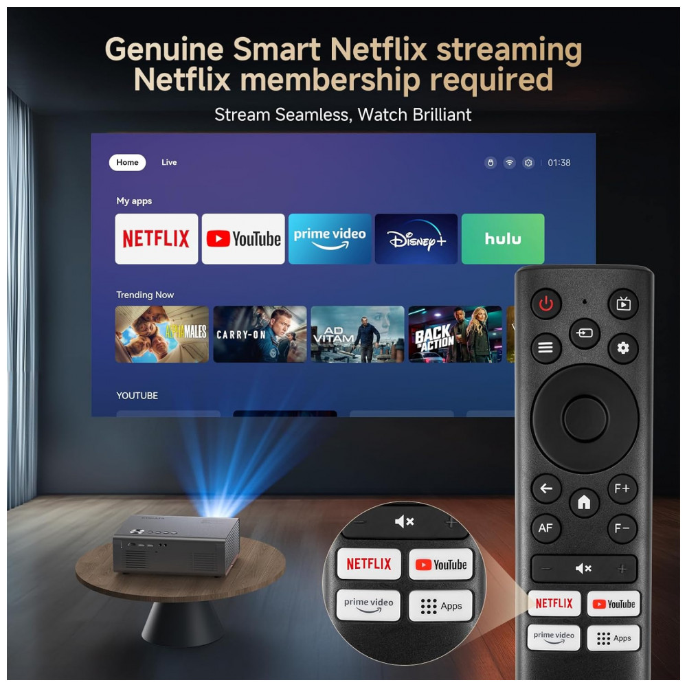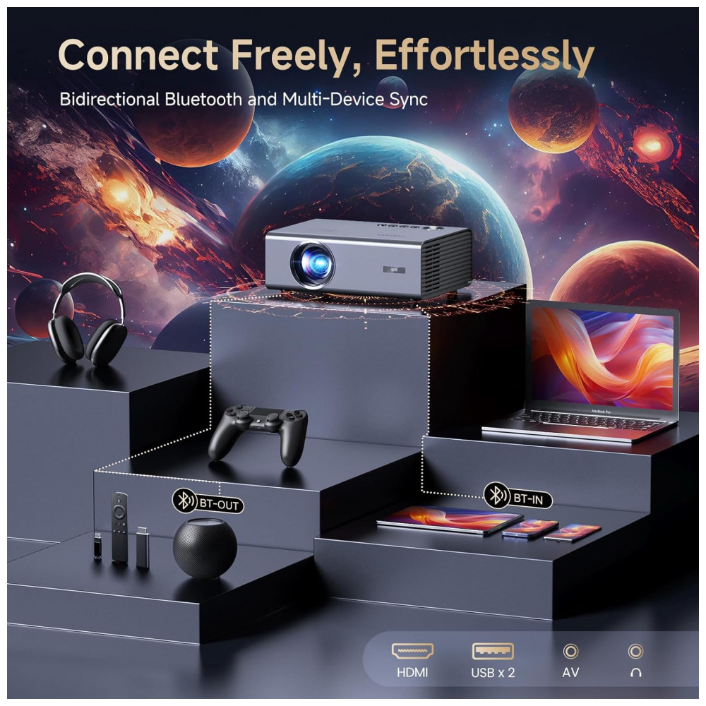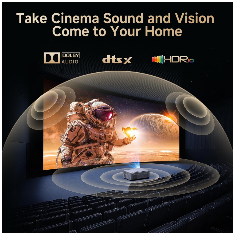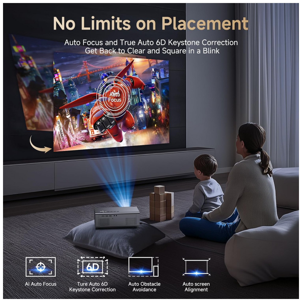 Versão de Atualização! Transmissão Ilimitada, Compatível com Netflix, Áudio Dolby, Áudio DTS. O projetor residencial Kogata GC357 vem com aplicativos Netflix, YouTube e Prime Video pré-instalados, juntamente com mais de 200 aplicativos adicionais disponíveis para download. Sem necessidade de sticks de TV extras – acesse programas exclusivos que não estão na loja de aplicativos e transmita diretamente pelo navegador do projetor 4K. Desfrute do áudio certificado Dolby e DTS para um som nítido e claro que traz a música, instrumentos e cada nota do concerto à vida, como se estivesse tocando ao seu lado. Seja para assistir a um filme ou para jogar, o som imersivo eleva toda a experiência. Um Banquete Visual Deslumbrante! Decodificação Completa 4K, Aprimorado por IA. Com o poderoso chipset MTK9660 e uma robusta configuração de memória de 28GB, o projetor residencial nativo 1080P oferece uma verdadeira decodificação 4K. Diferente de outros projetores com suporte 4K, nosso projetor 1080P se adapta totalmente ao conteúdo nativo 4K, proporcionando imagens nítidas e vibrantes que revelam cada detalhe. Aprimorado pela tecnologia de Qualidade de Imagem AI PQ, lentes alemãs de alta transmitância e HDR 10, este projetor inteligente garante transições naturais de luz para escuridão, cores ricas e tons de pele realistas. Desfrute de uma clareza e contraste excepcionais, mesmo como um projetor de teto, dando vida aos seus vídeos com imagens nítidas. Configuração Sem Esforço! Foco Automático, Correção Keystone 6D. Configurar seu cinema em casa nunca foi tão fácil! Com foco automático e correção Keystone 6D, os projetores de cinema ao ar livre ajustam automaticamente a imagem em um retângulo perfeito para caber na sua tela. Além disso, o projetor de telefone conta com zoom de 100 50 para ajustar o tamanho da tela sem precisar se mover, seja na parede ou na tela do projetor. Com recursos como esquiva automática de obstáculos e detecção de borda de tela, você pode pular a dificuldade dos ajustes manuais. Experimente a emoção de uma tela gigante de 300 polegadas com o projetor inteligente com aplicativos integrados. Perfeito para noites de filmes em família, este projetor de foco automático está pronto para usar em segundos! Conexão Perfeita! Suporte WiFi 6 Bluetooth. Equipado com WiFi 6, o projetor Kogata com WiFi e Bluetooth garante streaming e espelhamento de tela suaves e sem atrasos a partir dos seus dispositivos iOS ou Android. Seja para assistir a vídeos ou jogar conteúdo de jogos no projetor, a conexão WiFi rápida e confiável garante uma experiência perfeita. Graças aos seus canais Bluetooth duplos, você também pode usar o projetor portátil como uma caixa de som Bluetooth, conectando-o a alto-falantes externos ou fones de ouvido para uma experiência de áudio aprimorada. Entretenimento Tudo em Um! O Presente Perfeito. O projetor de vídeo Kogata não é apenas um projetor de filmes ao ar livre, mas também uma ferramenta versátil para trabalho e lazer. Além disso, este projetor inteligente com Bluetooth, WiFi e Bluetooth vem equipado com um controle remoto Bluetooth de alta sensibilidade, oferecendo controles responsivos aprimorados e amigáveis para o usuário. É o presente perfeito para amigos e familiares, oferecendo entretenimento e funcionalidade infinitos em uma embalagem elegante!