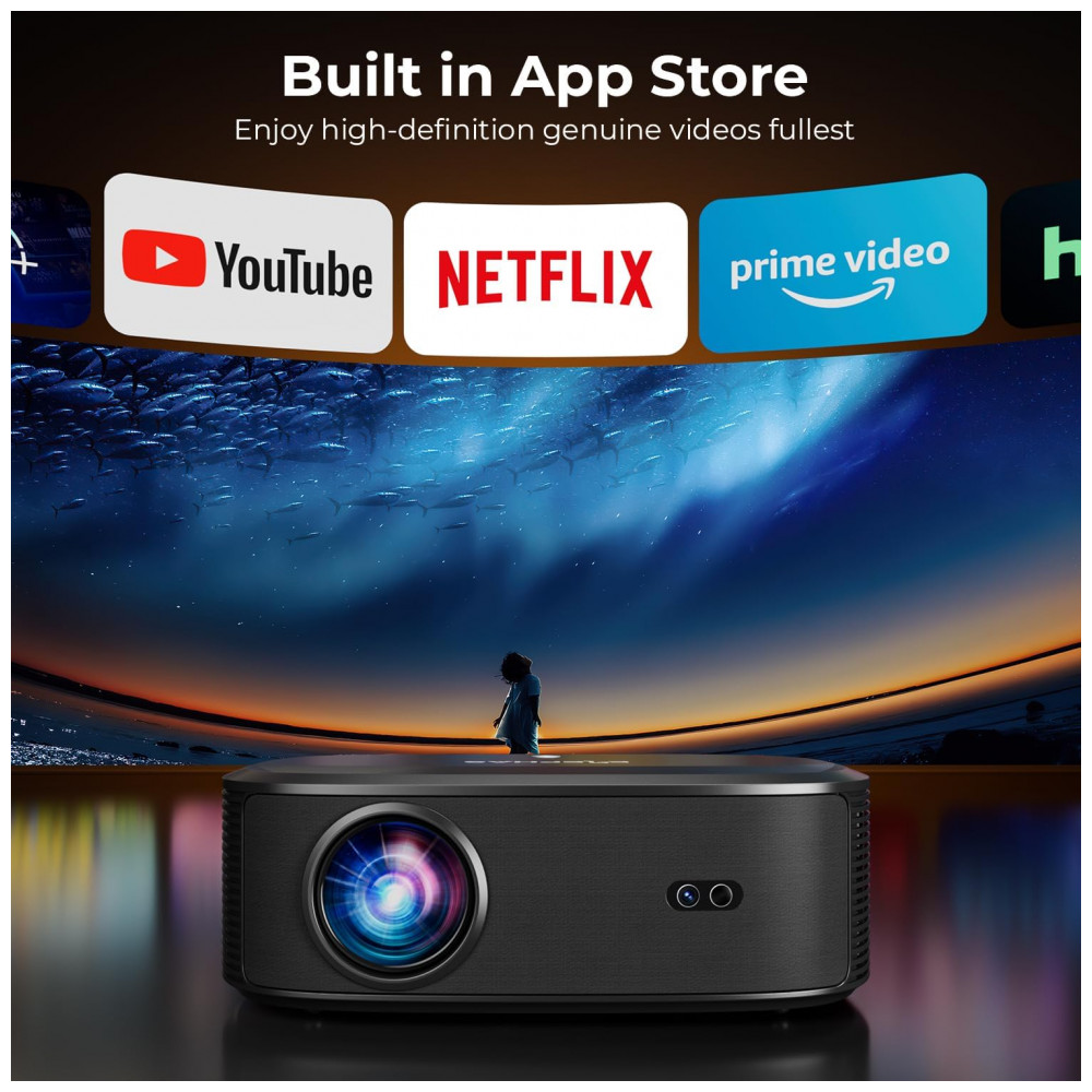 O projetor ELEPHAS W1K é um dispositivo portátil LED com resolução nativa 1920 x 1080 e suporte a 4K, equipado com loja de apps integrada para download de Netflix, YouTube, Prime Video e mais de 100.000 aplicativos. Serve para cinema doméstico e uso outdoor, com lentes de vidro de alta pureza para distribuição uniforme de imagem e fidelidade de cor em 20.000 lux, adequado para ambientes internos e externos.