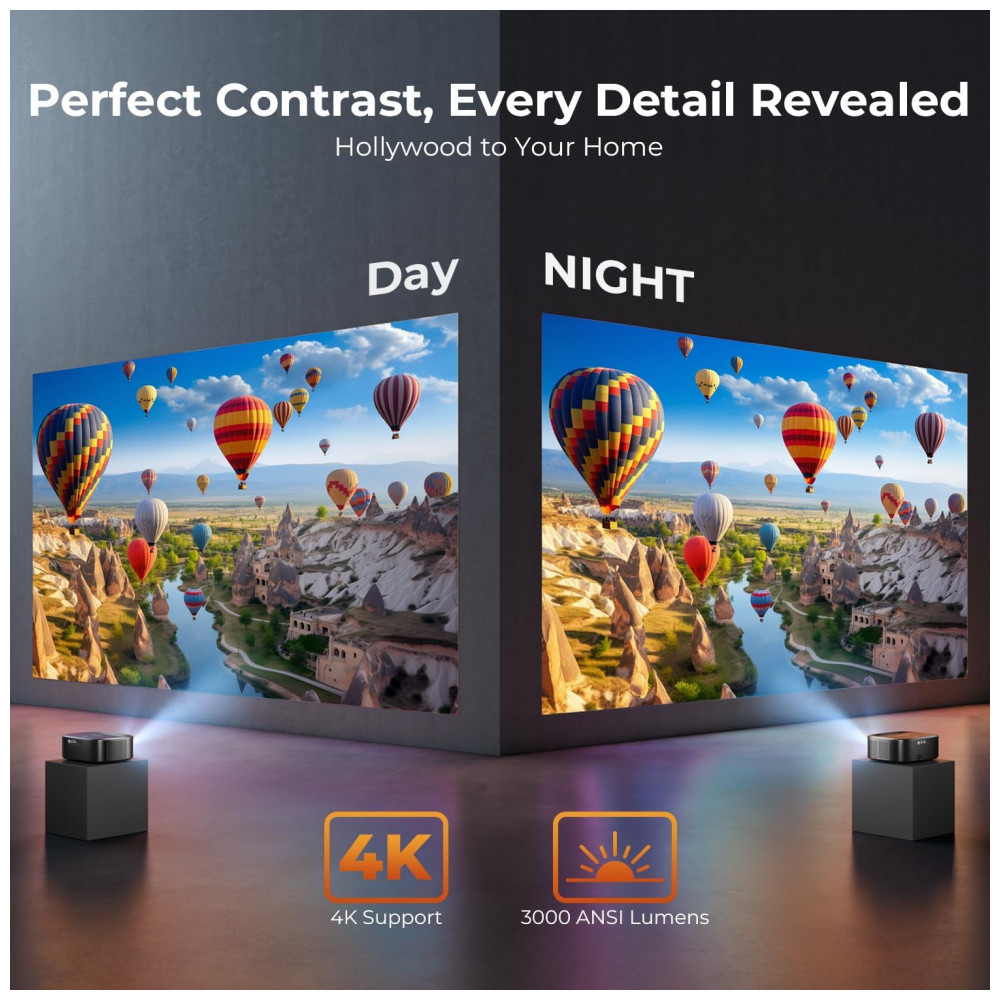Projetor 4K ELEPHAS Preto Wifi Bluetooth Auto Foco Keystone 3000 ANSI W1K