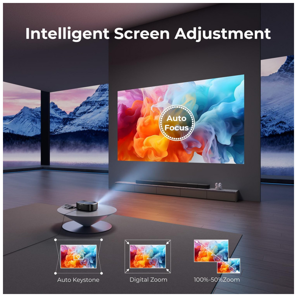 Possui foco automático com tecnologia anti-desfoco único, giroscópio de câmera de 30W e sensores para detecção de movimento em tempo real, além de correção keystone automática horizontal e vertical (±30°). Suporta zoom de 50% a 100% e espelhamento via Miracast de smartphones e outros dispositivos.