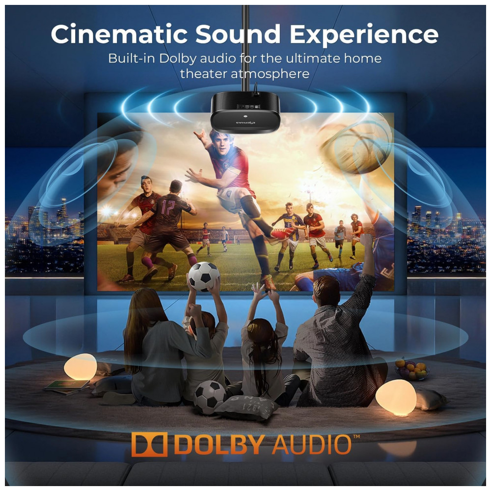 Inclui Wifi dual-band 5G/2.4G para transmissão rápida de dados e baixa latência, Bluetooth 5.2 para conexão com fones, caixas de som e AirPods, além de alto-falantes estéreo com efeitos Dolby. Portas HDMI, USB e compatibilidade com laptops, smartphones e tablets facilitam o uso em montagens no teto, mesa ou parede.