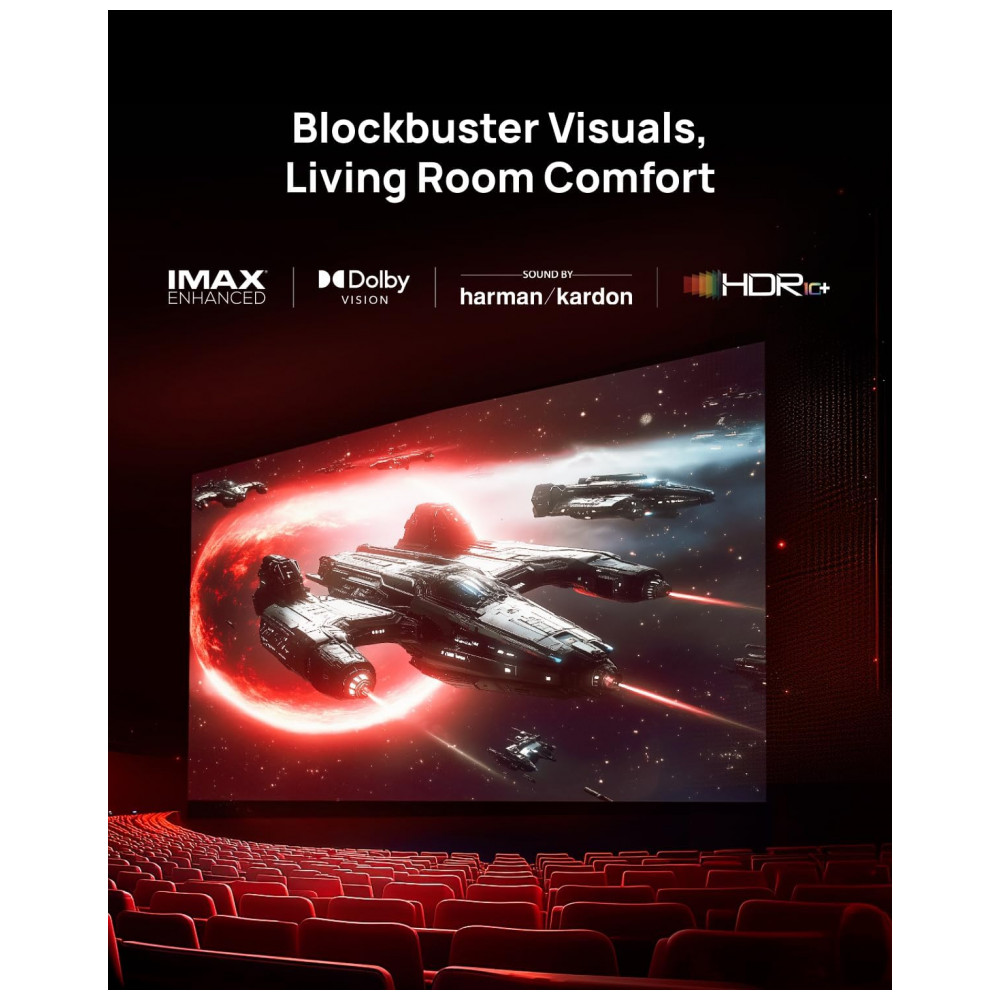 O sistema de áudio utiliza alto‑falantes Harman Kardon integrados, dimensionados para salas de pequeno e médio porte, com suporte a formatos de som imersivo compatíveis com a plataforma Google TV. A construção foi pensada para uso contínuo em ambientes internos, com design para uso aparente em salas de cinema em casa, salas de TV e espaços de jogos.