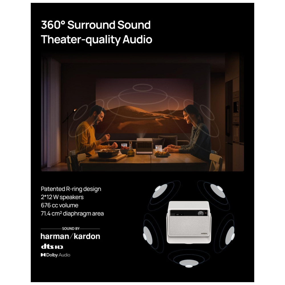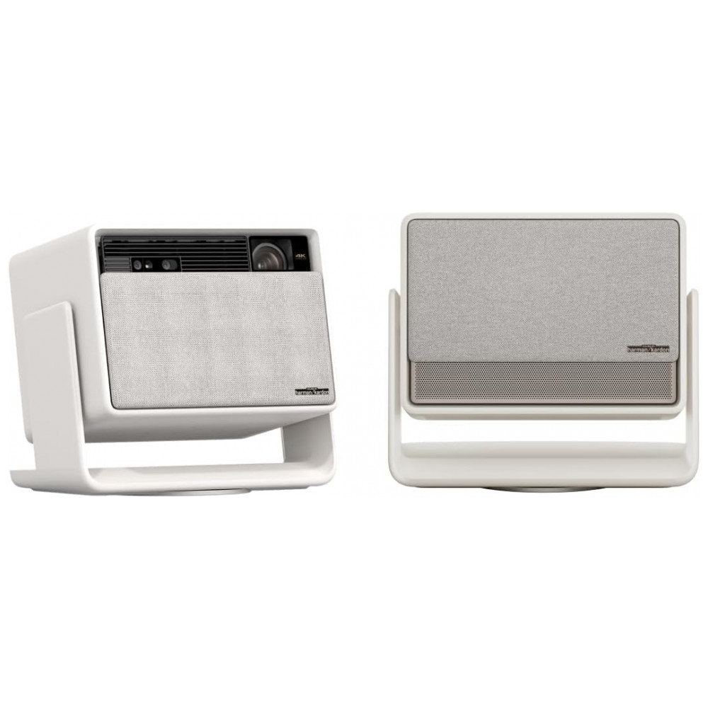 O áudio é fornecido por dois alto-falantes Harman Kardon de 12 W cada, com suporte a diversos padrões de áudio surround, garantindo som estéreo com boa distribuição em salas de pequeno e médio porte. O projetor também oferece modo de baixa latência para jogos e recurso de interpolação de quadros, otimizando a fluidez de movimentos em conteúdos com ação rápida.