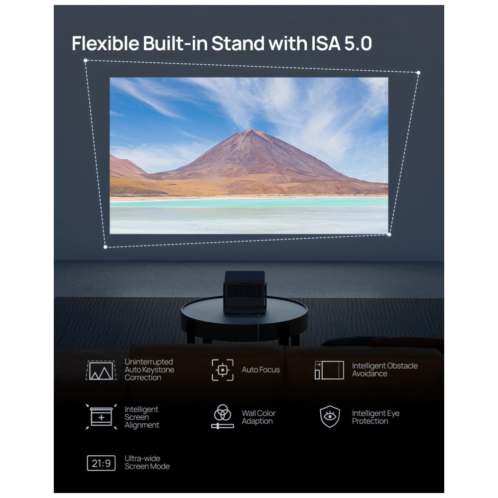 A tecnologia Dual Light 2.0, com fonte de luz híbrida e chip DLP de 0,47″, garante vida útil de até 20.000 horas, mantendo brilho e cores estáveis ao longo do tempo. O sistema ISA 5.0 integra foco automático, correção automática de keystone contínua, alinhamento inteligente de tela, desvio automático de obstáculos e adaptação à cor da parede, reduzindo a necessidade de ajustes manuais e facilitando a instalação.