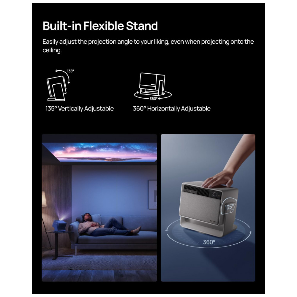 A base flexível embutida dispensa suportes adicionais, permitindo ajustar o ângulo de projeção em diferentes direções, inclusive para projeções voltadas ao teto. O projetor é compatível com conteúdo 3D em Full HD mediante uso de óculos ativos adequados, sendo indicado para salas de TV, salas de cinema em casa e ambientes multimídia.
