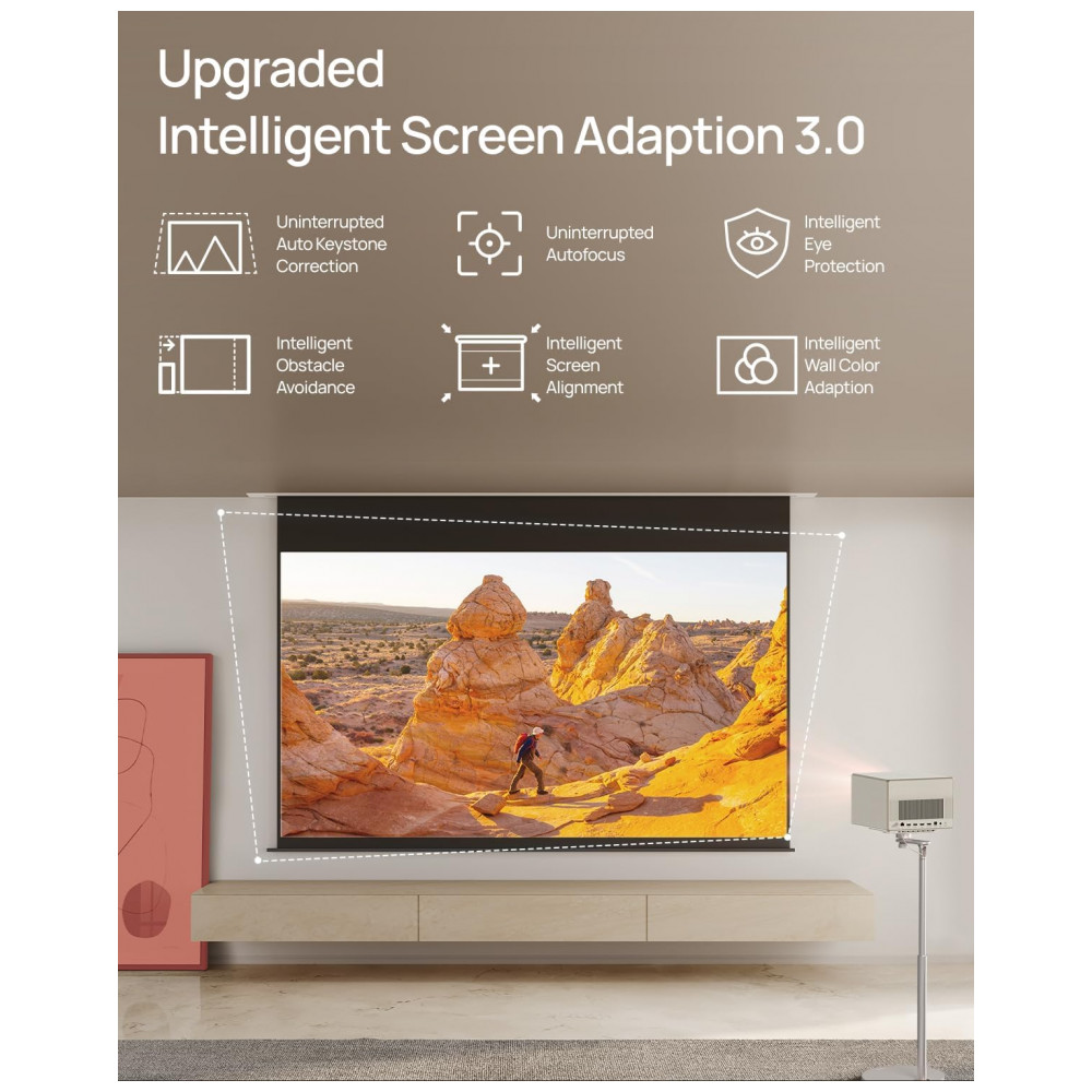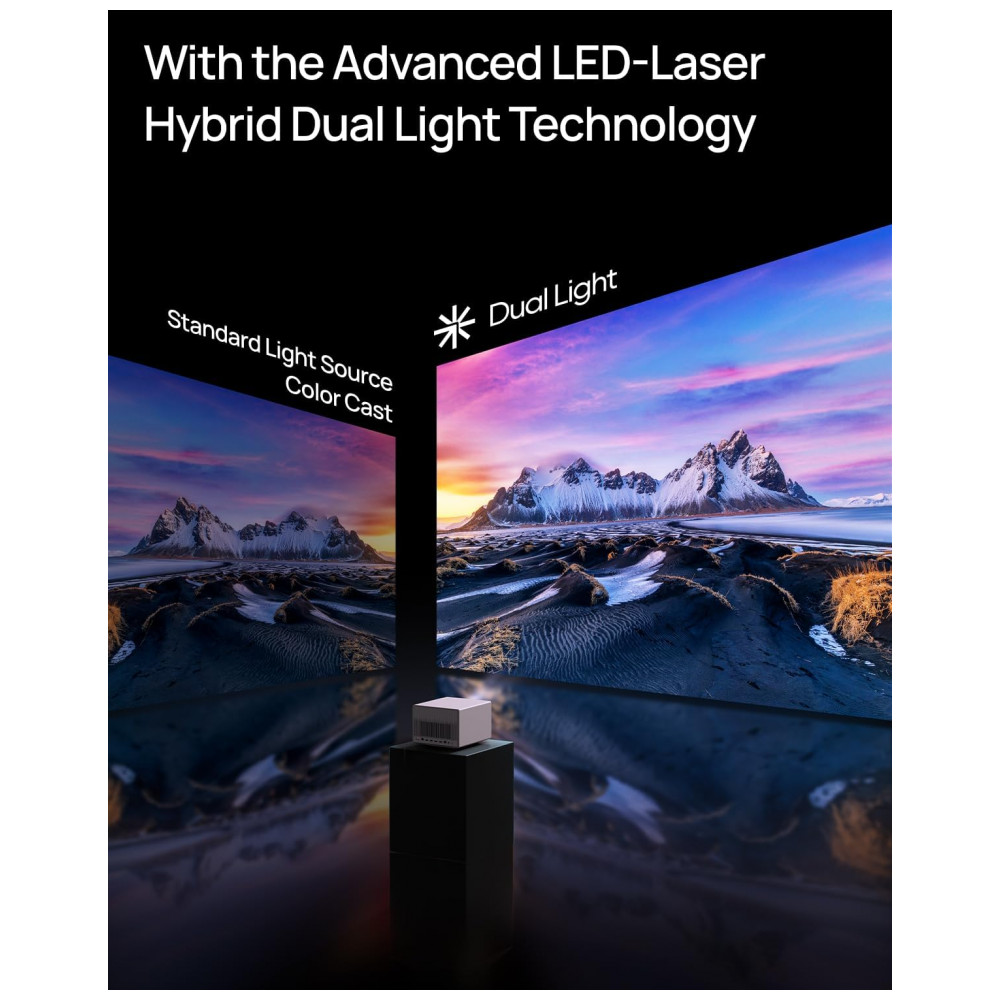 A tecnologia Dual Light utiliza fonte de luz híbrida LED e laser para elevar o brilho mantendo controle de precisão de cores e redução de artefatos ópticos, com vida útil projetada para uso prolongado em ambientes residenciais. O sistema Intelligent Screen Adaption 3.0 agrega foco automático, correção automática de keystone, alinhamento de tela, zoom sem perda e adaptação à cor da parede, permitindo ajuste rápido da imagem ao posicionar o projetor.