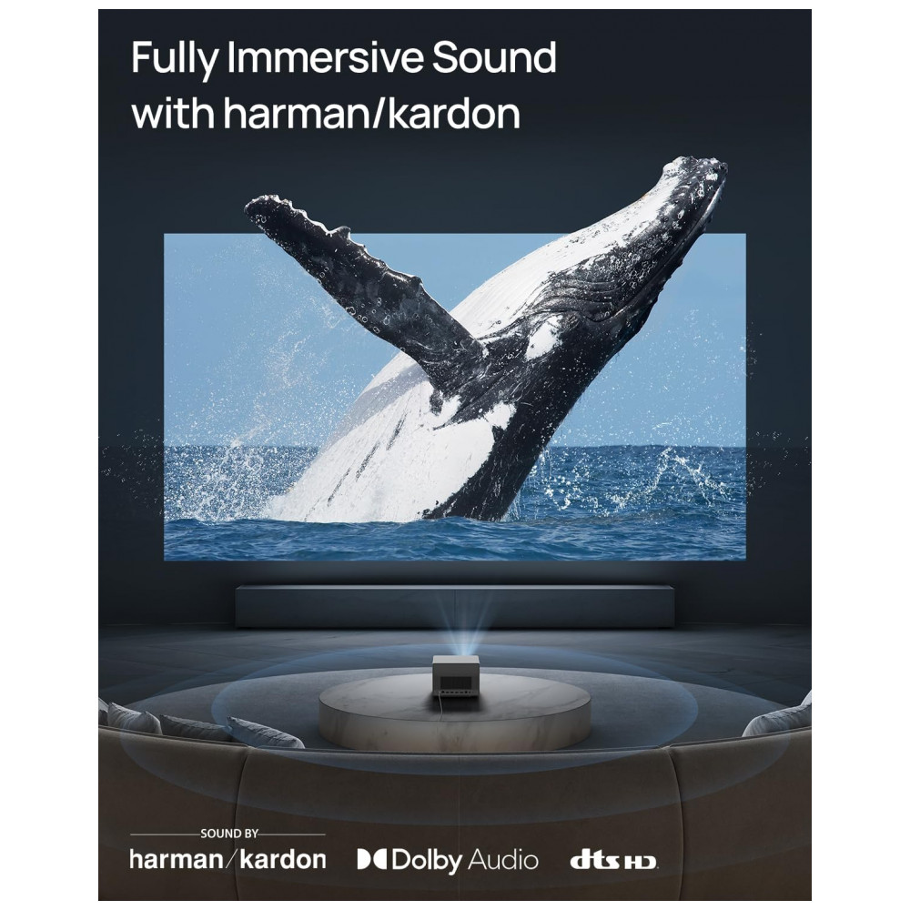 O sistema de som integrado possui dois alto‑falantes Harman Kardon de 12 W, dimensionados para salas de pequeno e médio porte, com suporte a formatos de áudio multicanal compatíveis com o sistema. O projetor também oferece modo de jogo com baixa latência, adequado para consoles e PCs, e suporte a conteúdo 3D ativo com óculos compatíveis, ampliando as possibilidades de uso em entretenimento doméstico.